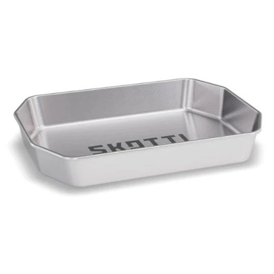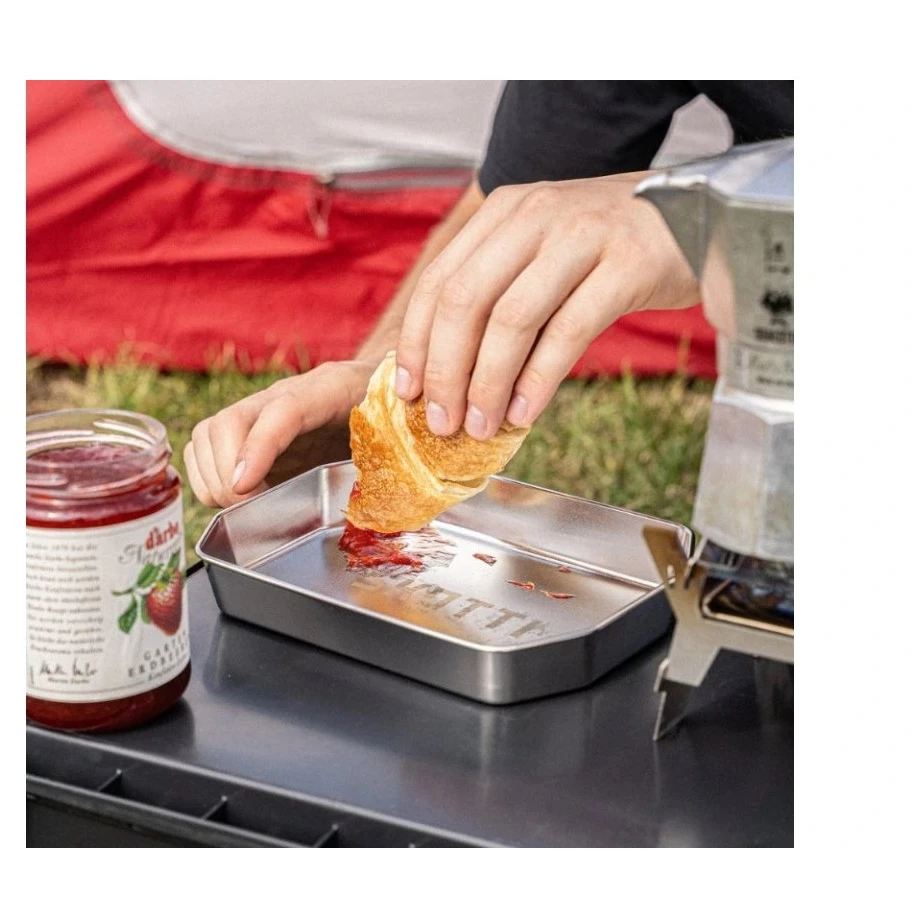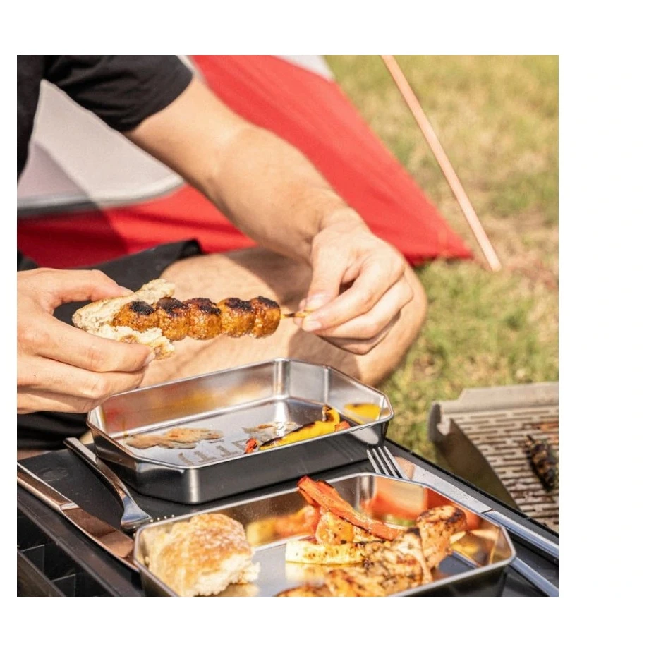 Il piatto da campeggio SKOTTI Piastra in resistente acciaio inossidabile offre una pratica forma rettangolare per una conservazione salvaspazio e un facile utilizzo durante i viaggi e la cucina all'aperto.