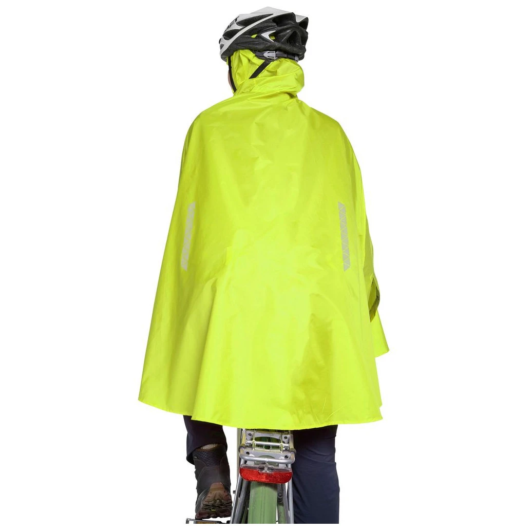Il poncho ha un cappuccio con coulisse che può essere indossato sotto o sopra il casco da bici. Grazie all'elastico in vita, rimane saldamente in posizione anche quando si pedala controvento e due passanti per il pollice assicurano che il poncho rimanga al suo posto. Per un maggiore comfort, ci sono spacchi sui lati per una maggiore libertà di movimento delle braccia.