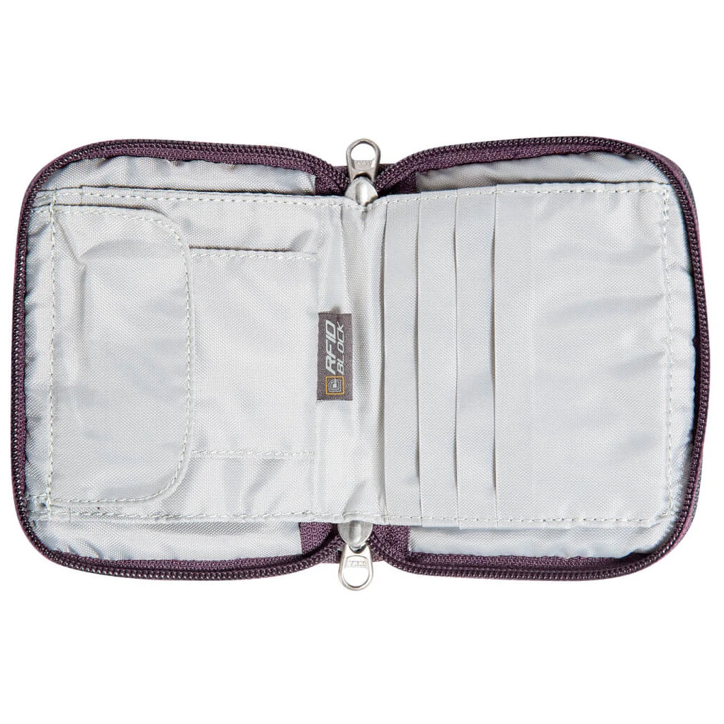 Il portafoglio si chiude con una zip integrale, può essere completamente aperto e offre uno scomparto per banconote, una tasca segreta con zip, quattro slot per carte, una tasca trasparente per documenti e anche una tasca per monete con chiusura a velcro.