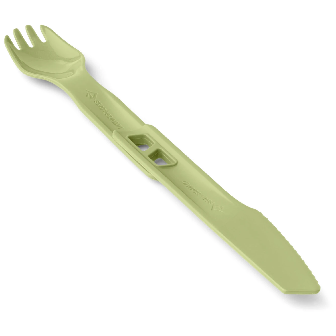 Il coltello è dotato di una lama completamente seghettata di tipo sheepsfoot, sufficientemente ampia per tagliare e spalmare. Lo spork ha una superficie liscia per un uso confortevole e un manico strutturato che garantisce una presa salda anche con le mani bagnate.