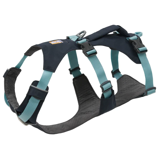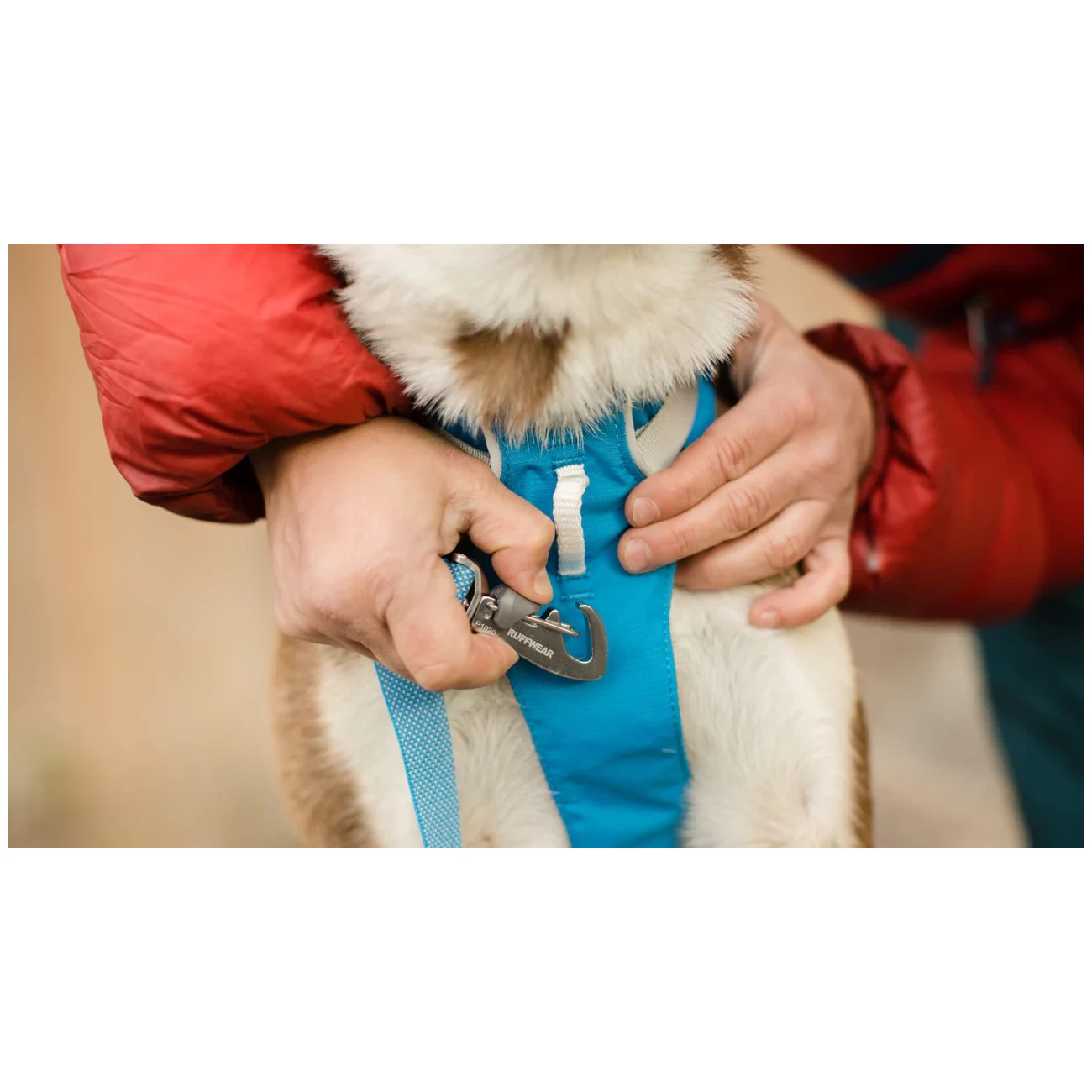 L'imbracatura è completamente regolabile in sei punti tramite fibbie in plastica, adattandosi così a tutte le forme e dimensioni dei corpi dei cani. Il materiale interno è resistente allo sporco e ai peli. I tre punti di attacco per il guinzaglio sono molto versatili. L'anello a D in alluminio sul retro è completato da due passanti rinforzati. Uno è posizionato sulla schiena e uno sul petto, destinato ai cani che tirano. L'imbracatura ha un bordo riflettente per una migliore visibilità in condizioni di scarsa illuminazione e sul manico c'è un punto per il fissaggio della luce Ruffwear The Beacon™ Safety Light.
