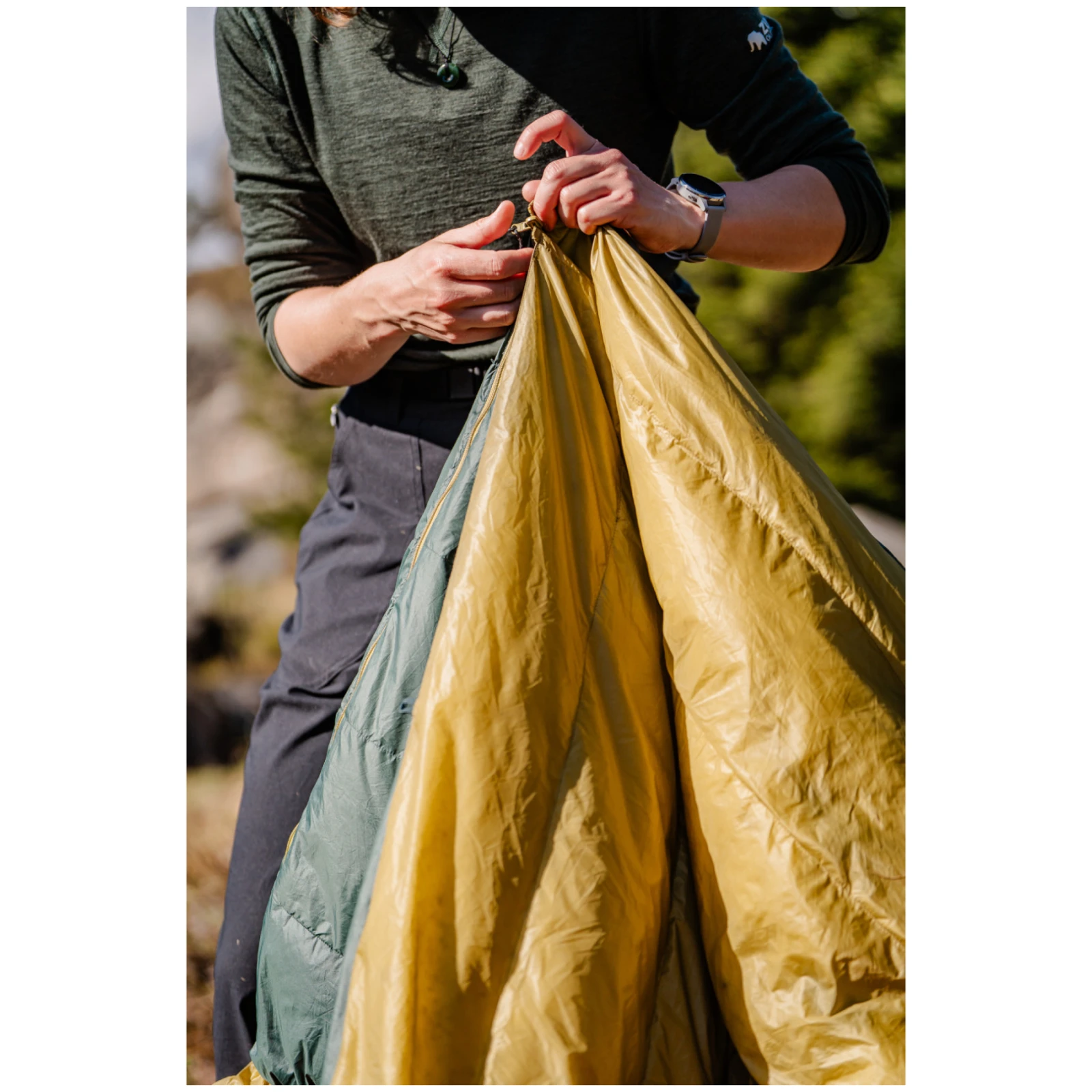 Il quilt è progettato per essere il più versatile possibile. Utilizzando le cinghie staccabili, può essere fissato al materassino, eliminando così la perdita di calore lungo i fianchi e prevenendo lo scivolamento durante il sonno. Nella parte inferiore, il quilt può essere unito in un tunnel chiuso, in modo da poter essere utilizzato in modo simile a un sacco a pelo classico. I piedi rimangono protetti e la parte superiore rimane più libera per un maggiore comfort o ventilazione. Nella stagione più fredda, può essere utilizzato come strato aggiuntivo per aumentare il comfort termico di un sacco a pelo classico. Oltre al pernottamento nella natura, il quilt può essere utilizzato anche come coperta universale per rilassarsi in campeggio, bivacco o come coperta leggera e compatta per i viaggi.