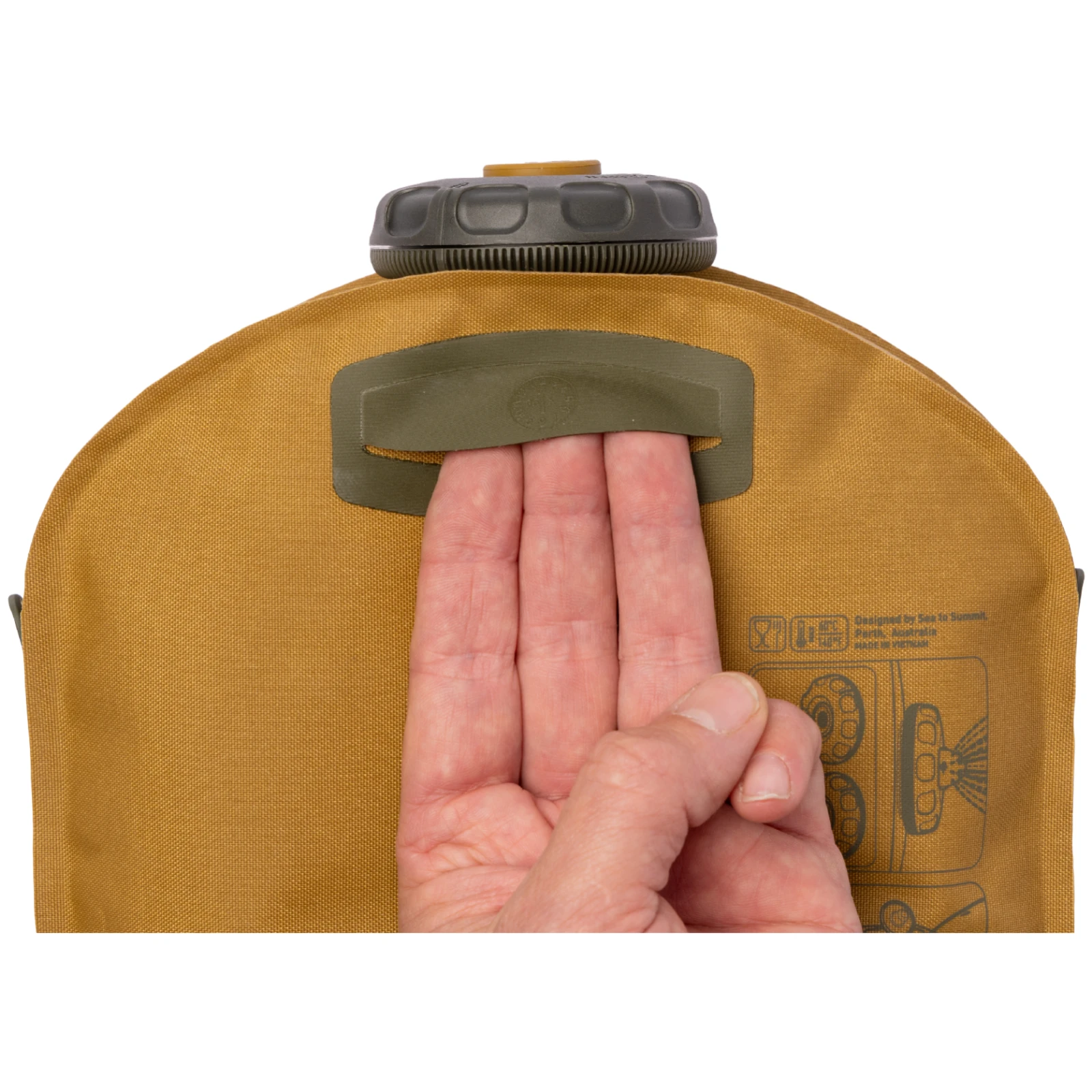 Una maniglia fissa strategicamente posizionata facilita il riempimento e un deflettore all'interno della borsa assicura che la borsa non si gonfi quando è riempita al massimo, oltre a facilitare lo svuotamento e l'asciugatura alla fine del viaggio.