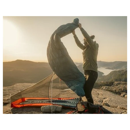 Ha un'imbottitura in piuma d'anatra da 600 cuin e un rapporto piumino/piuma di 85/15, che isola perfettamente. Ciò è favorito dal colletto termico di nuova forma, che avvolge strettamente le spalle e impedisce la dispersione del calore. Il cappuccio ha cordini su entrambi i lati e un colletto che protegge il viso. La comoda forma a mummia 3D migliora l'isolamento termico e offre comfort. L'area intorno ai piedi ha una forma particolare , simile a una pinna di squalo, che consente ai piedi di rimanere distesi nella loro posizione naturale durante la notte.