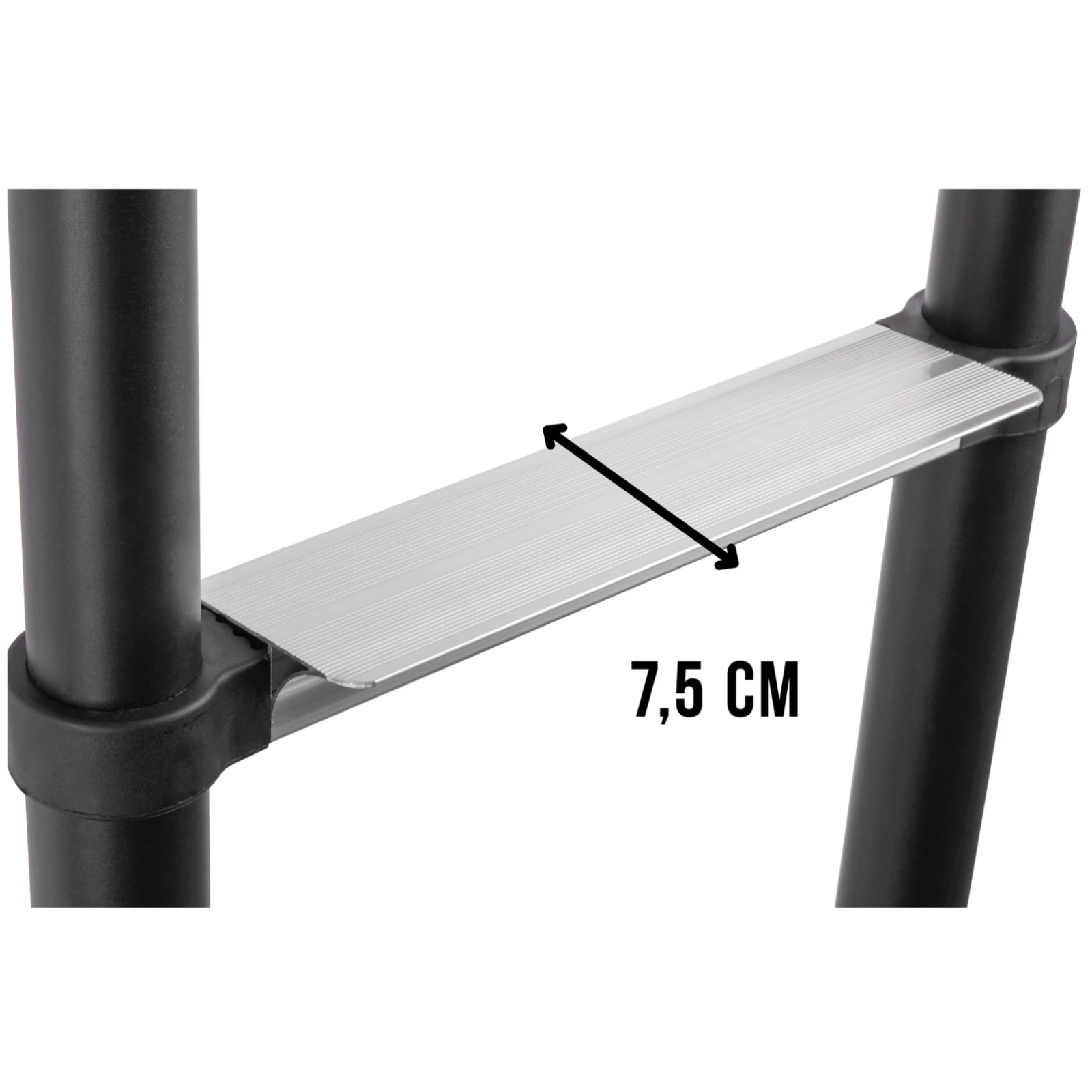 Brunner Laddy Alcove AIR è una scala innovativa in alluminio progettata per garantire il massimo comfort e sicurezza durante la salita. Grazie ai gradini appositamente angolati, fornisce un appoggio stabile e consente di stare comodamente in piedi anche a piedi nudi. È ideale per l'utilizzo con tende da tetto, letti a castello o per la manutenzione di veicoli.