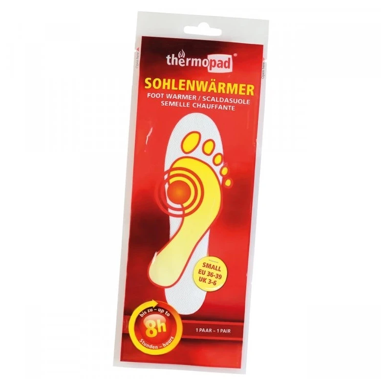 Scaldapiedi Il Thermopad S prodotto dall'azienda Yate viene utilizzato principalmente per riscaldare i piedi in caso di maltempo. Questo aiuta l'utente a evitare raffreddori e possibili incidenti. Il riscaldatore reagisce a contatto con l'ossigeno e quindi richiede un certo tempo per riscaldarsi. Dovrebbe durare da 5 a 12 ore (a seconda delle condizioni ambientali) ed è monouso. La confezione contiene una coppia alla volta.
