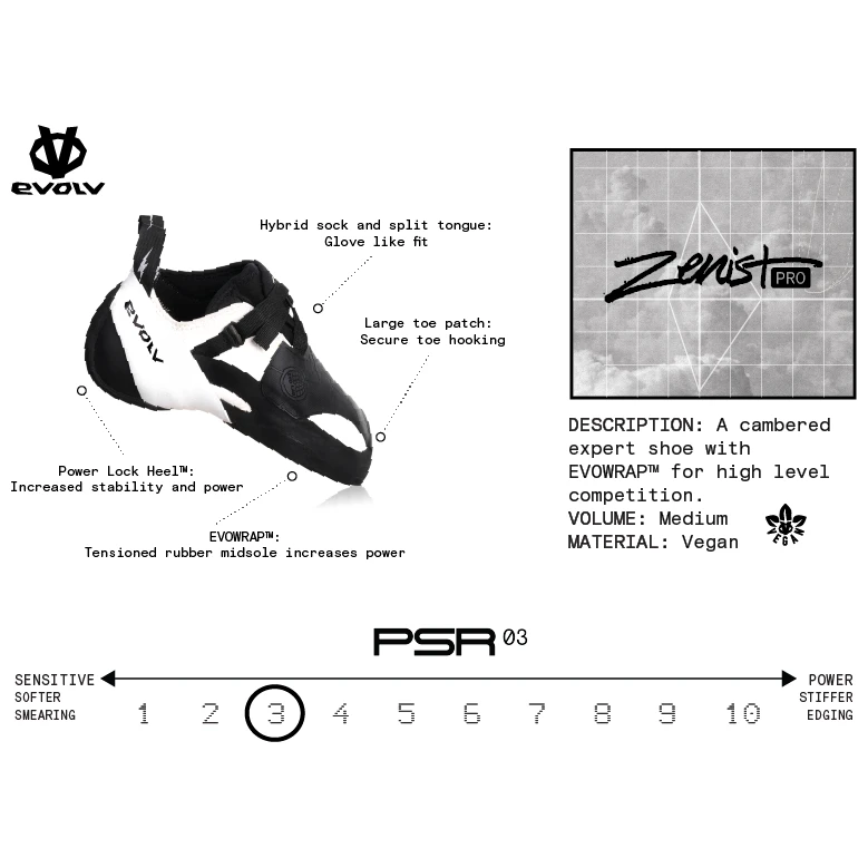 Il modello Zenist Pro combina la tecnologia EVOWRAP™ con la nuova suola Contour™, la tecnologia Power Lock Heel™ e la gomma super aderente TRAX SAS® creando una scarpetta che offre una versatilità senza pari nel passaggio dai movimenti dinamici ai delicati appoggi in aderenza e negli scambi di piede. Le Zenist Pro sono l'evoluzione del modello originale Zenist: scarpette da allenamento minimaliste trasformate in un'arma da competizione di alto livello.