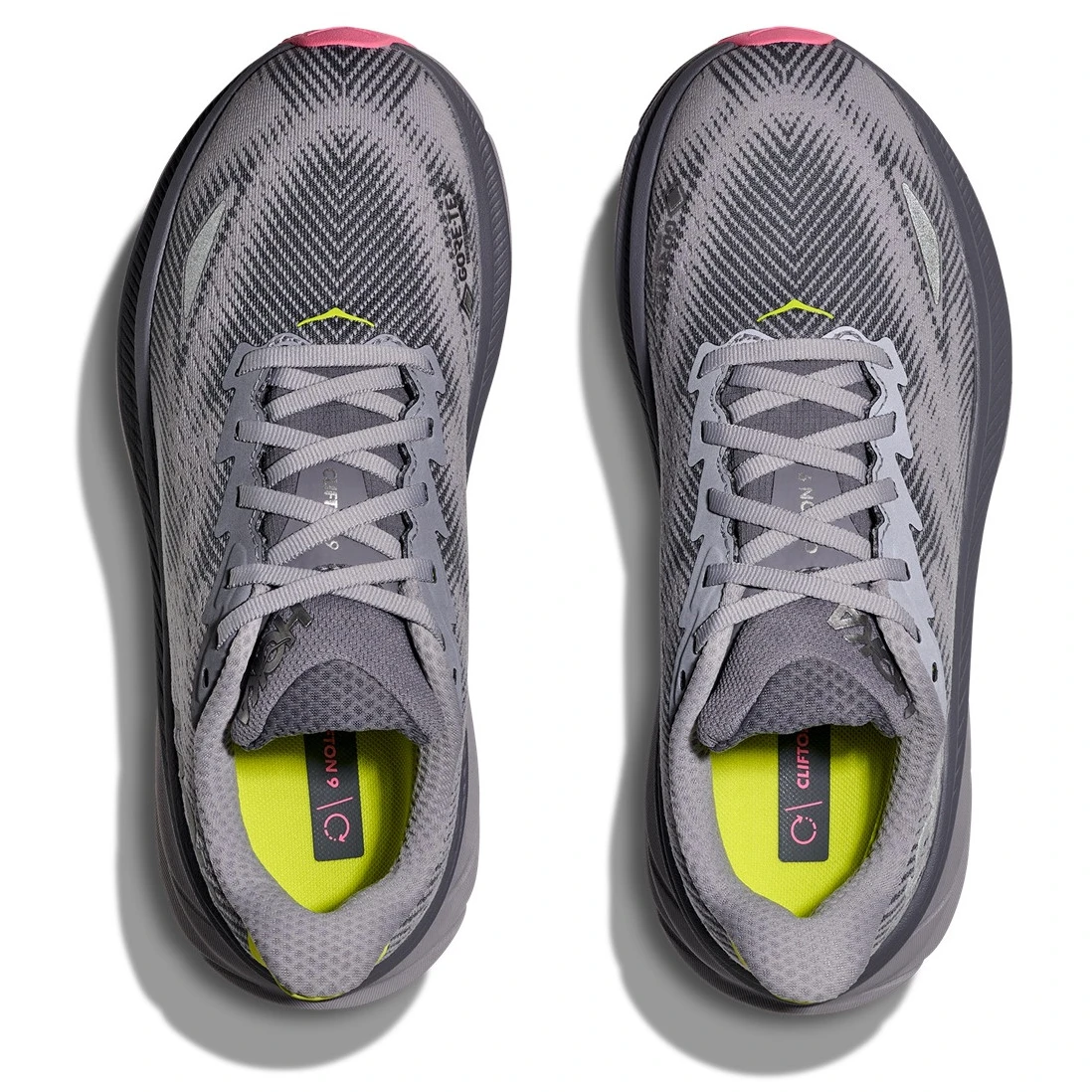 Le scarpe da running da donna W Clifton 9 Gtx del produttore Hoka hanno ricevuto un resistente aggiornamento impermeabile sotto forma di membrana invisibile GORE-TEX Invisible Fit. Unisce il comfort leggendario a una maggiore resistenza agli agenti atmosferici. Grazie al nuovo strato di ammortizzazione CMEVA, è più leggera che mai e offre una corsa ancora più fluida anche in caso di pioggia. La tomaia è realizzata in maglia tecnica con materiali riciclati, traspirante ma protettiva contro l'umidità. La gomma con moduli di trazione garantisce un passo sicuro anche su superfici bagnate.