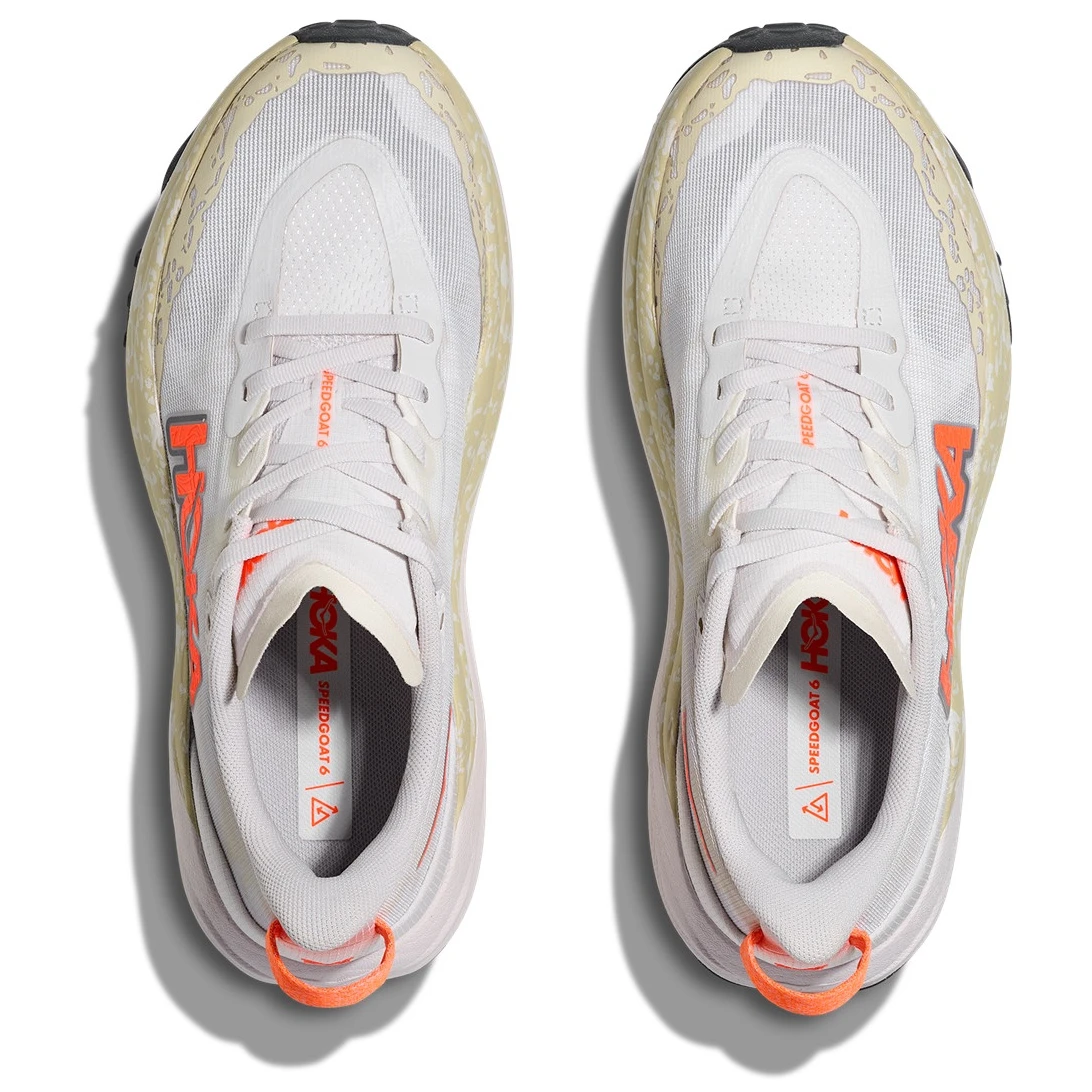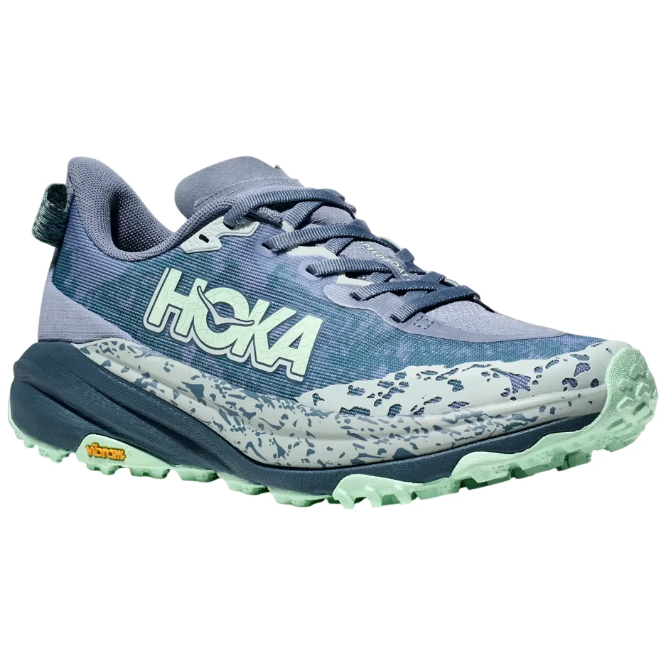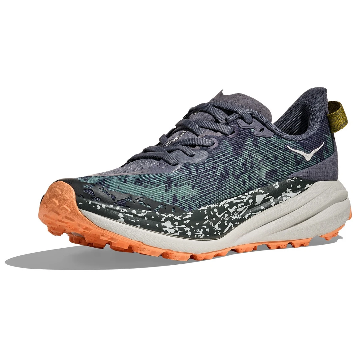 La scarpa da corsa Speedgoat 6 di Hoka è progettata per i percorsi tecnici. 6. la generazione ritorna con un peso ridotto e una grande trazione. Questa scarpa continua dalla suola ai lacci con un'intersuola Vibram® Megagrip e un capocorda di trazione per migliorare l'aderenza sui terreni sciolti. La Speedgoat 6 mantiene la stessa altezza della suola e la stessa forma rocker (curvatura della suola), utilizza una mescola più leggera per l'intersuola e una rete jacquard a due strati più spessa che ispira fiducia su qualsiasi terreno .