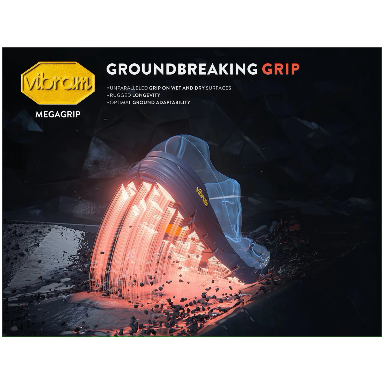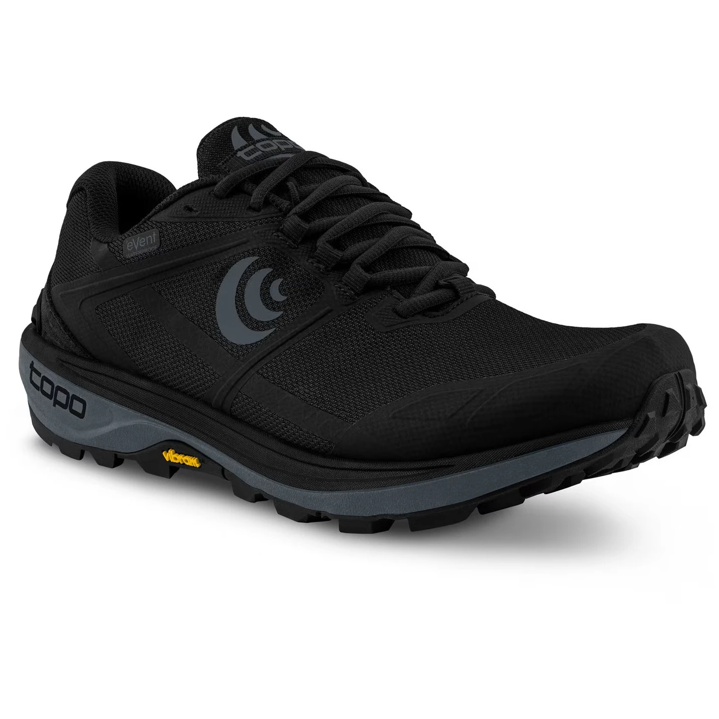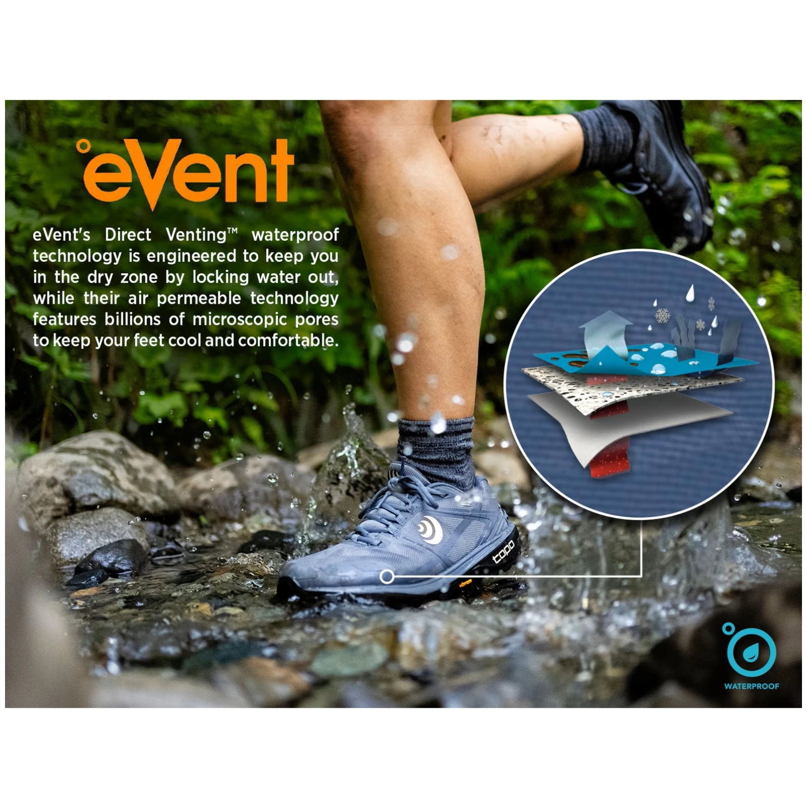 Le scarpe da trail running da uomo Terraventure 4 WP di Topo vantano una piattaforma più ampia per un'ammortizzazione ancora maggiore e protezione sotto il piede, con una flessione migliorata delle dita per una transizione rapida e una corsa fluida. L'intersuola è migliorata con la nuova schiuma memory ZipFoam™ per un perfetto equilibrio tra ammortizzazione morbida e reattività, mentre la suola Vibram® Megagrip offre un'ottima trazione e aderenza. Le scarpe hanno anche una costruzione impermeabile eVent®, quindi i tuoi piedi rimarranno completamente asciutti e comodi anche sul bagnato.
