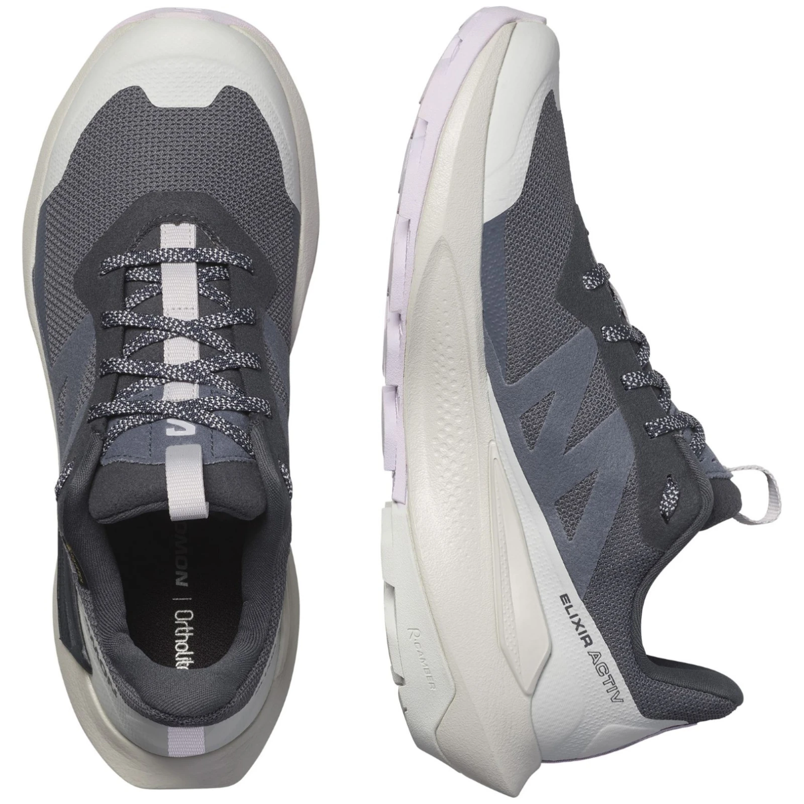 Gli scarponi da trekking da donna Elixir Activ Gore-Tex del marchio Salomon sono compagni di viaggio senza compromessi. Active La tecnologia Chasis combina una mescola morbida dell'intersuola e una geometria specifica della suola per una falcata fluida e confortevole, aumentando la sicurezza e fornendo supporto laterale.