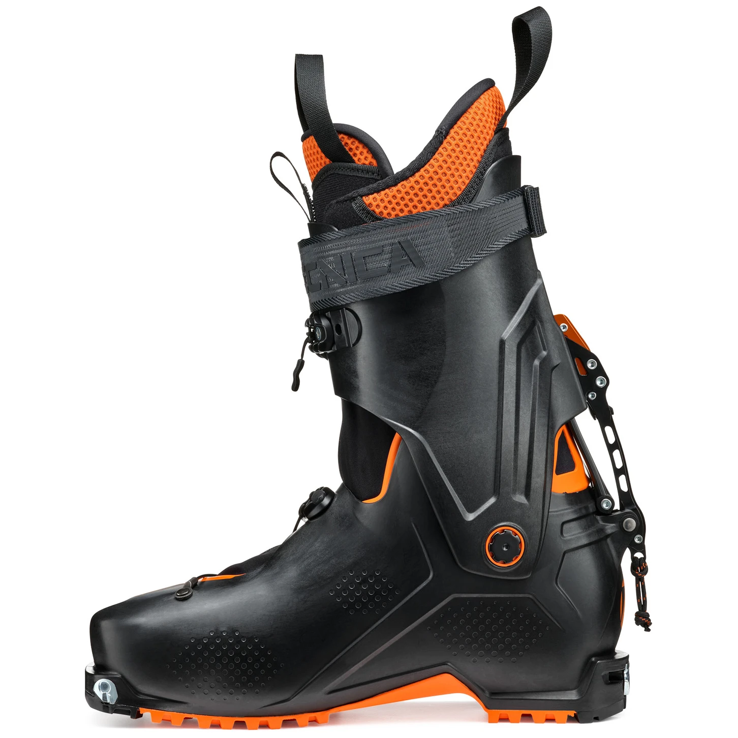 L'efficiente meccanismo a leva singola T-Hike garantisce la massima libertà di movimento con un'escursione di 75 gradi e la regolazione dell'inclinazione in base alle proprie esigenze. Lo scafo è collegato al gambetto in due punti separati e, non appena lo scarpone è in modalità di salita, garantisce una libertà di movimento illimitata. Inoltre, lo spoiler interno conferisce alla scarpa una forza unica in discesa. La suola Vibram rinforzata in carbonio offre una trazione ottimale su terreni diversi. La punta e il tallone sono realizzati in materiale più resistente e robusto, mentre sul resto della superficie è presente un materiale aderente modellato.