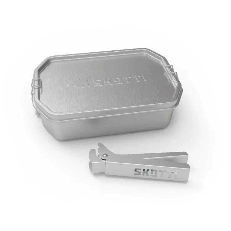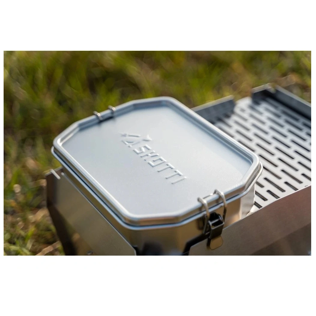 Il box per alimenti SKOTTI da 1L è un contenitore multifunzione in acciaio inox che espande le possibilità del grill pieghevole SKOTTI e allo stesso tempo serve come scatola per alimenti resistente. Grazie alle robuste pinze in alluminio, il contenitore può essere afferrato in sicurezza e utilizzato direttamente sulla griglia come pentola o padella più piccola, il che è utile ad esempio per scaldare salse, cuocere pasta o soffriggere verdure. Il fondo del contenitore occupa esattamente metà della griglia, così puoi cucinare e contemporaneamente grigliare altro cibo sull'altra metà.
