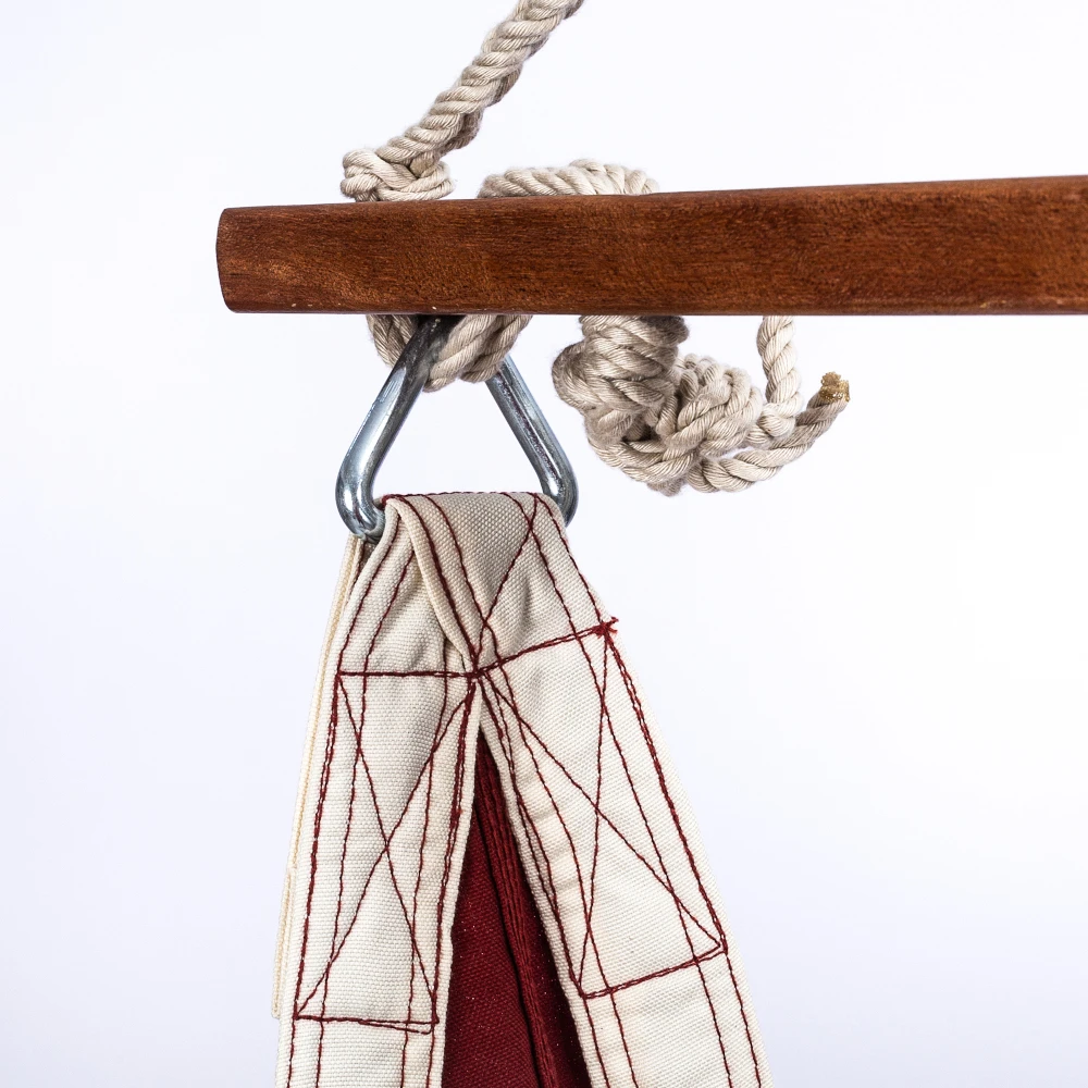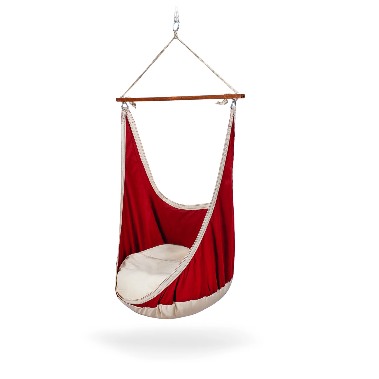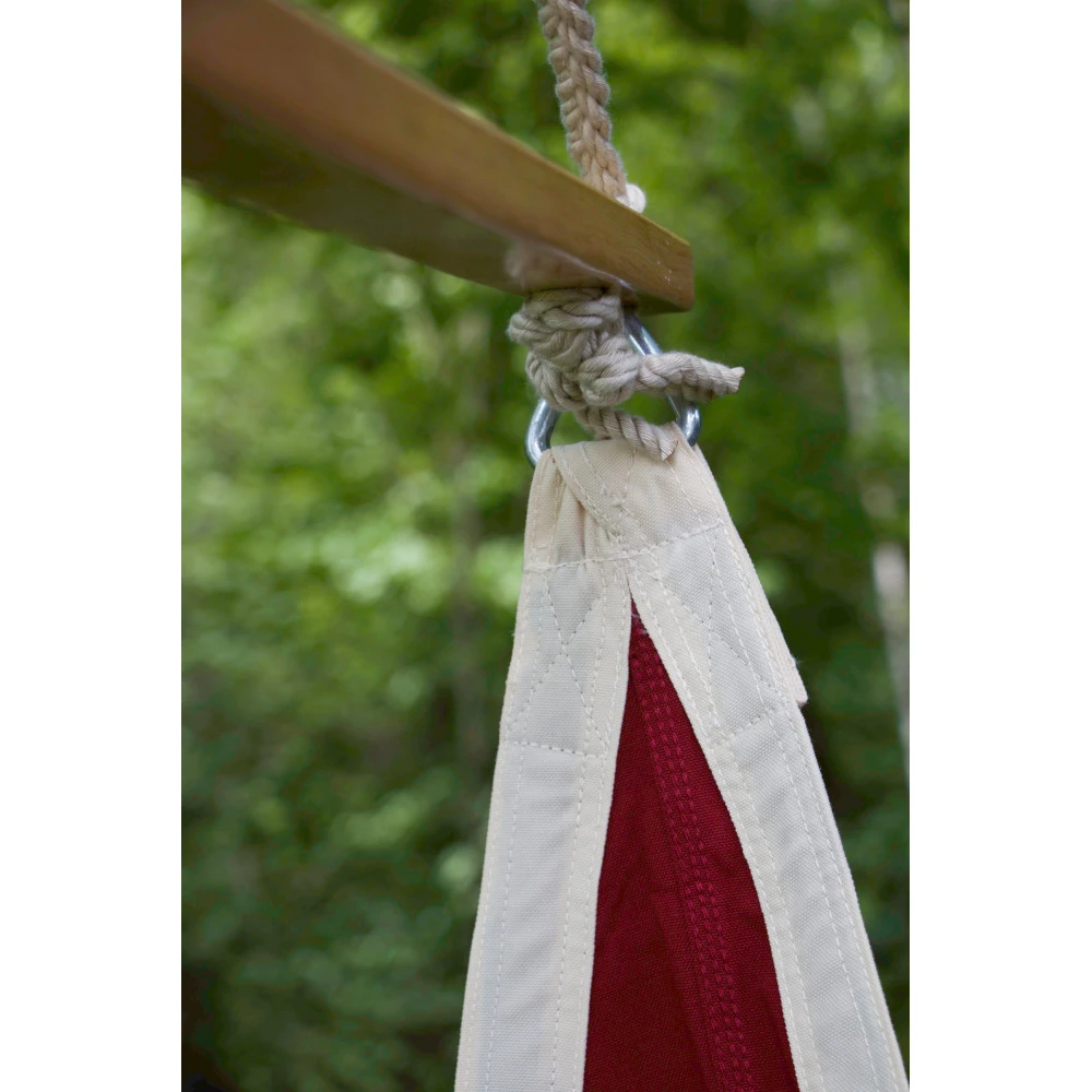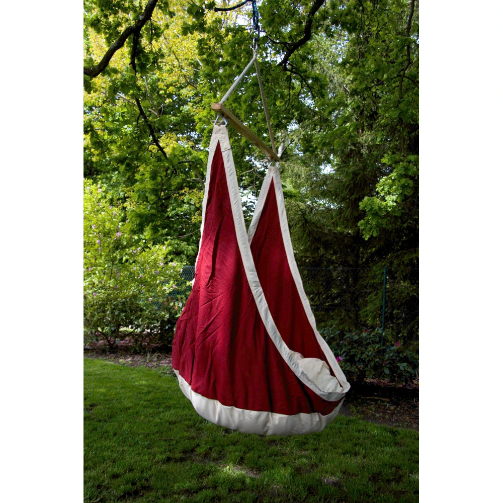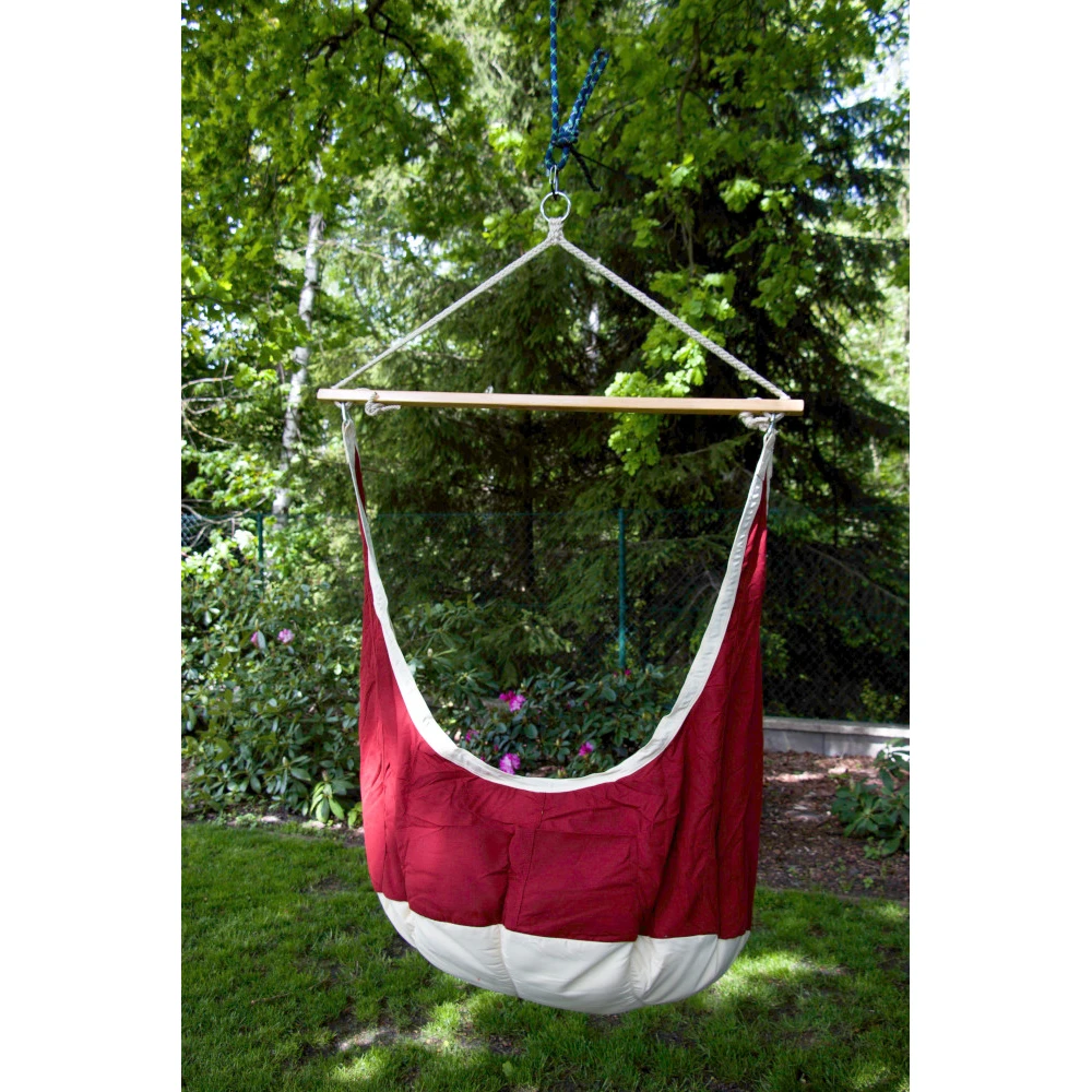 Godetevi il comfort della sedia a dondolo Hamaka Lounge. I fianchi alti vi proteggeranno parzialmente dal mondo esterno, ma avrete comunque una vista. Il rinforzo in legno fa sì che i lati della sedia non si accavallino e mantengano una forma confortevole per la seduta. Si può sprofondare nel morbido cuscino e studiare, leggere o semplicemente rilassarsi. La sedia è realizzata in cotone di alta qualità.