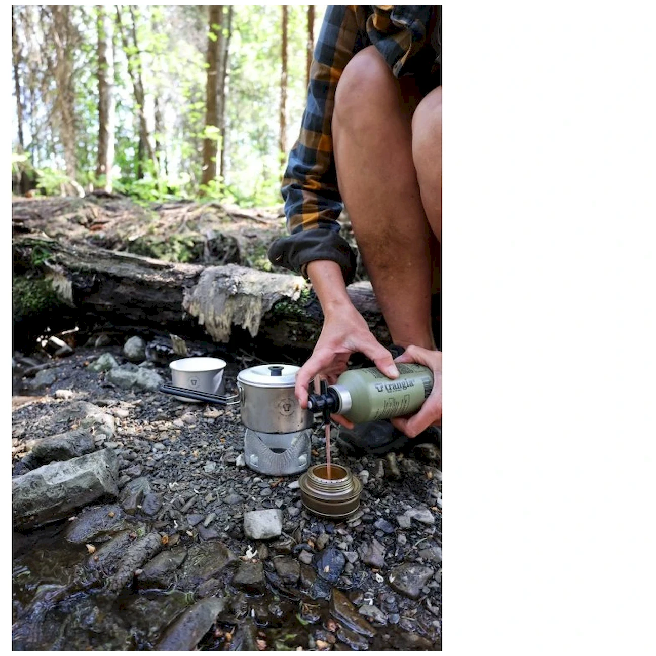Il set include una tazza T-Cup con coperchio, manico pieghevole, paravento e fornello ad alcool. È la soluzione perfetta per preparare un pranzo veloce da condividere con un amico o per avventurieri solitari. Quando è riposto, tutti i componenti entrano nella tazza T-Cup e il manico si blocca facilmente sul coperchio. Tenere il manico in plastica lontano dalla fiamma diretta.