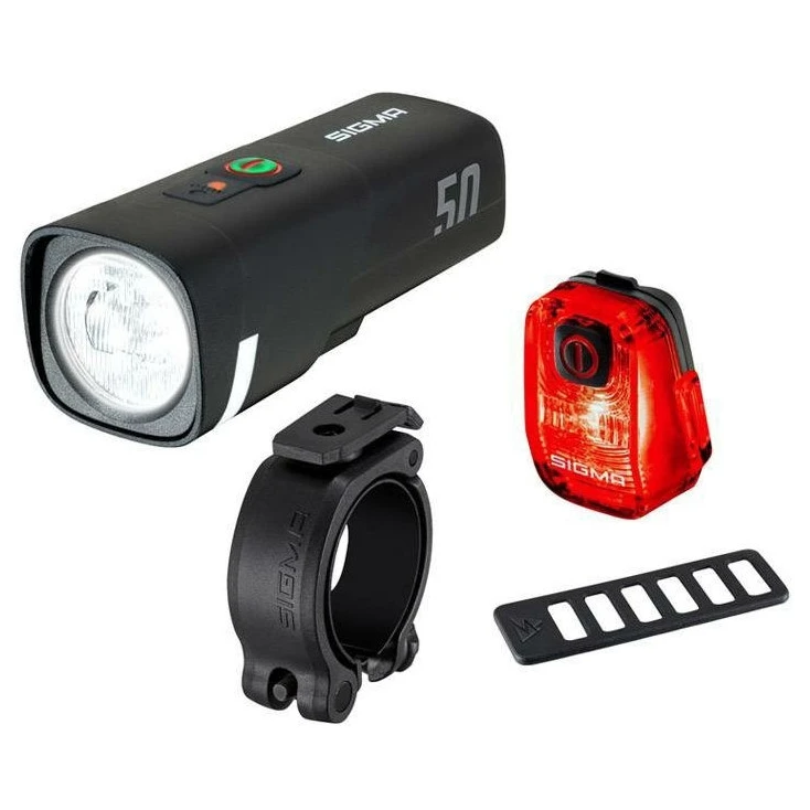 Set di luci Sigma Aura 50 + Hiro 10: luce anteriore intelligente con sensore di luminosità e luce posteriore affidabile per una guida sicura in tutte le condizioni.