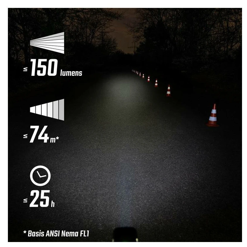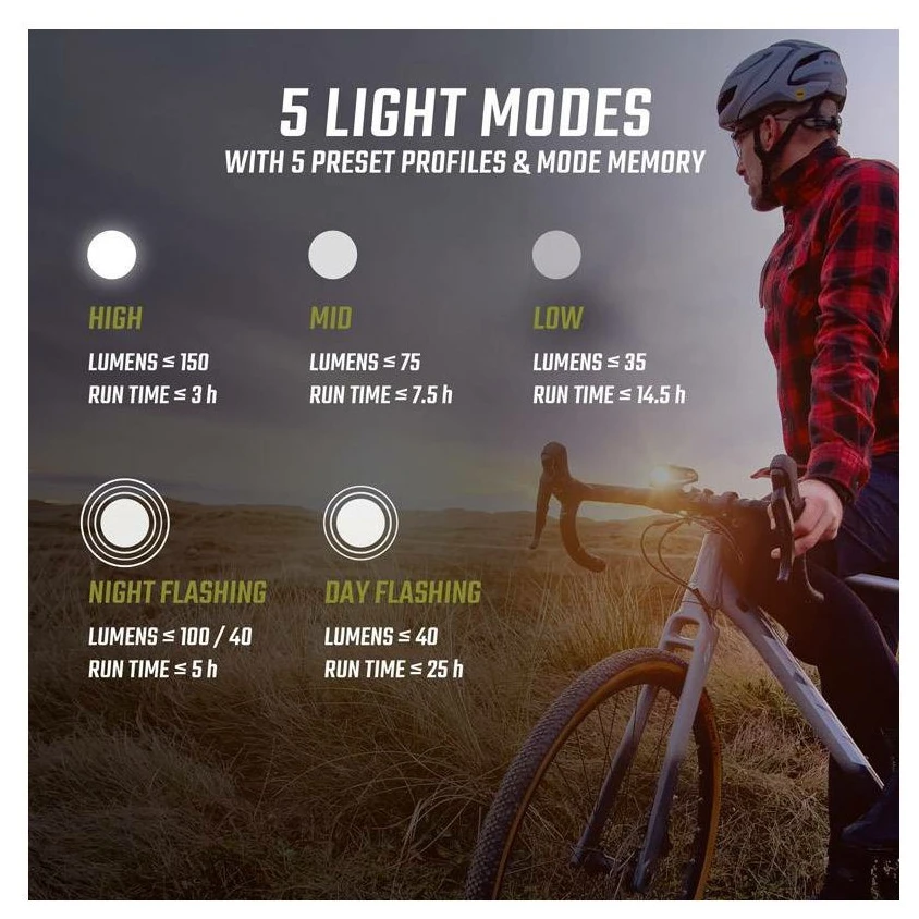 - Luce anteriore Buster 150: 150 lumen, portata 74 m, 5 modalità (High/Mid/Low/Day & Night Flashing), durata fino a 25 ore