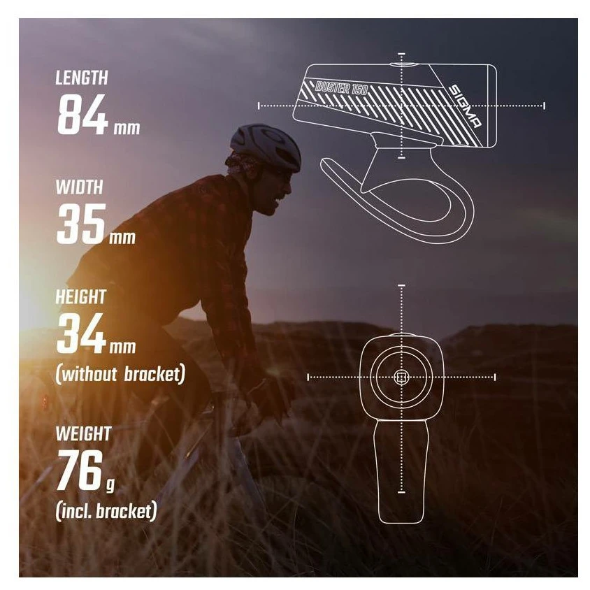 Il set di luci Sigma Buster 150 + Nyte 10 combina una potente luce anteriore con 150 lumen di potenza e una portata fino a 74 metri con una luce posteriore leggera e di lunga durata visibile a 500 metri. La luce anteriore Buster 150 offre 5 modalità di illuminazione, memoria dell'ultima impostazione e fino a 25 ore di autonomia. In modalità High, la luce Buster 150 raggiunge una potenza luminosa di 150 lumen per un massimo di 3 ore, in modalità Mid brilla fino a 7,5 ore con una potenza luminosa di 75 lumen. E se per caso la gita si prolungasse, in modalità Low dura in modo affidabile fino a 14,5 ore.