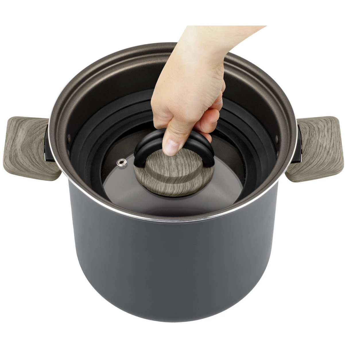 La pentola/padella esterna ha manici pieghevoli per una conservazione compatta e salvaspazio. Questo versatile set è compatibile con tutti i tipi di piani cottura, inclusa l'induzione. È inclusa una maniglia rimovibile per le pentole e le padelle interne.