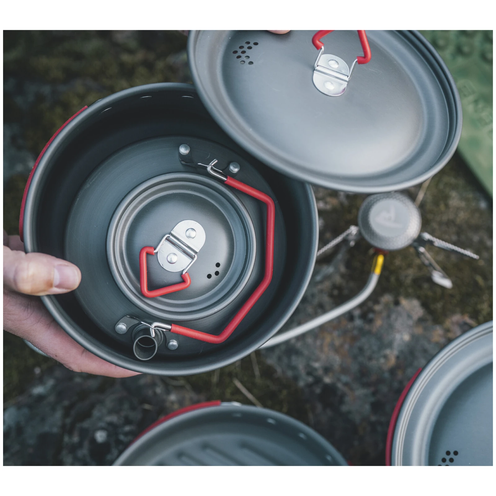 Il set è progettato per un trasporto pratico, le singole parti si incastrano l'una nell'altra e risparmiano spazio nell'attrezzatura da campeggio. Grazie alla sua struttura resistente, è adatta per un uso ripetuto in attività di cottura all'aperto più impegnative.