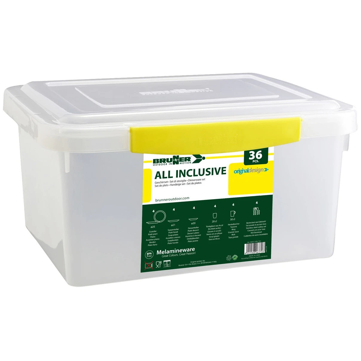 Il set di stoviglie All Inclusive Bluebay del marchio Brunner contiene un equipaggiamento completo per il campeggio. Il set è composto da 36 pezzi di stoviglie e posate ed è adatto per 4 persone. In campeggio apprezzerete la maggiore durata grazie alla melamina. Questo materiale è resistente agli urti, facile da pulire, resistente al calore e all'umidità, inodore e insapore e rispettoso dell'ambiente. I piatti possono essere messi in freezer e in lavastoviglie.