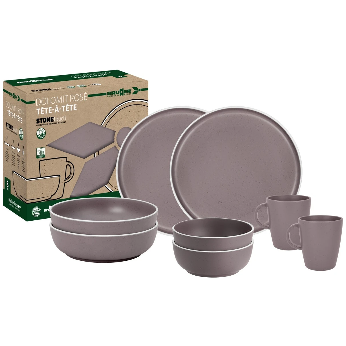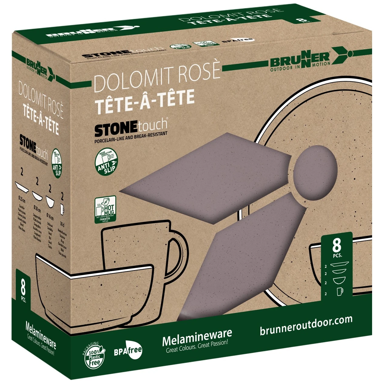Il Dolomit Set tete-a-tete di Brunner contiene l'attrezzatura da campeggio essenziale. Il set è composto da 8 pezzi ed è adatto a 2 persone. In campeggio apprezzerete la maggiore durata grazie alla melamina. Questo materiale è resistente agli urti, facile da pulire, resistente al calore e all'umidità, inodore e insapore e rispettoso dell'ambiente. I piatti possono essere messi in freezer e in lavastoviglie.