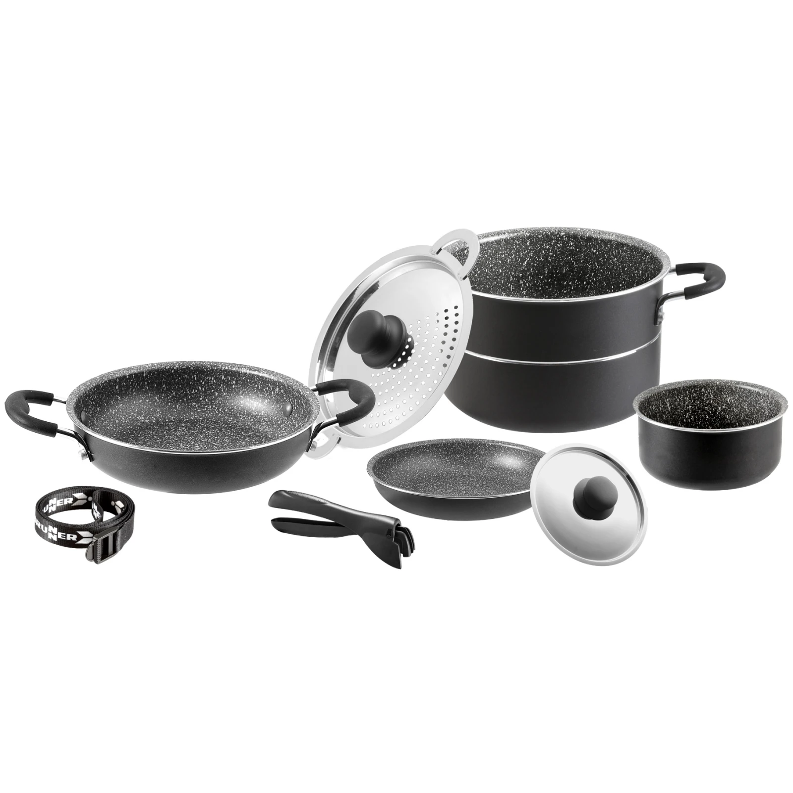 Set pirata 7+1 20 cm del marchio Brunner è la scelta perfetta per i viaggi e il campeggio, dove si risparmia spazio prezioso. La superficie antiaderente garantisce una cottura confortevole senza bruciature. Il Pirata comprende 2 pentole, 2 padelle e 2 coperchi, uno dei quali è dotato di un colino. Il trasporto e la conservazione sono garantiti da una cinghia che tiene insieme l'intero set.