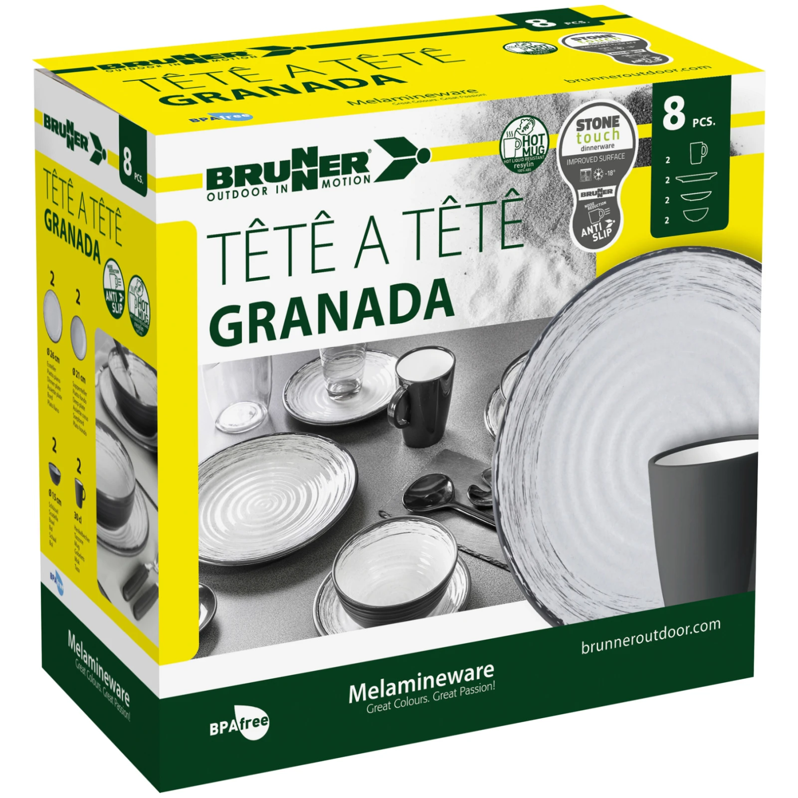Il set tête-à-tête Granada è un elegante set di stoviglie in melamina per due persone. Il design leggero e resistente con finitura antiscivolo è ideale per il campeggio, i viaggi e le cene all'aperto.