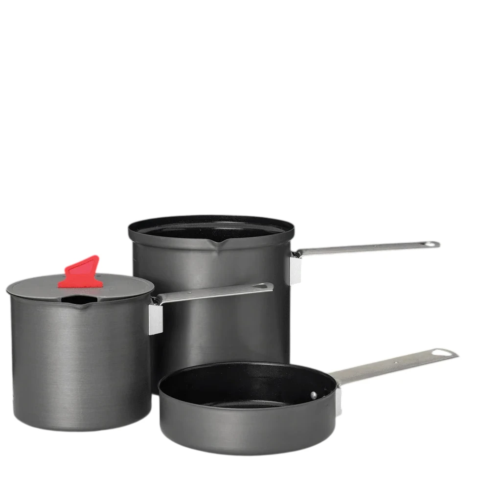 Primus Trek Pot è un set di pentole salvaspazio per cucinare all'aperto e in campeggio. Due pentole, una padella e tre manici possono essere impilati insieme, risparmiando spazio durante il trasporto.