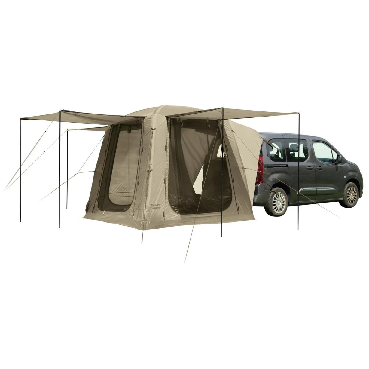 La tenda è dotata di tre ingressi con zanzariera e abside, due laterali e uno anteriore, e si fissa direttamente alla quinta porta del veicolo con clip per le ruote e grandi ventose fisse per le finestre. Sul retro della tenda si trova anche un piccolo "tunnel" di collegamento, che garantisce una perfetta aderenza all'auto ed elimina gli sguardi dei passanti. Il sistema di corde di ancoraggio a più punti garantisce la stabilità della tenda anche in caso di vento forte e potete fissarla come meglio credete.