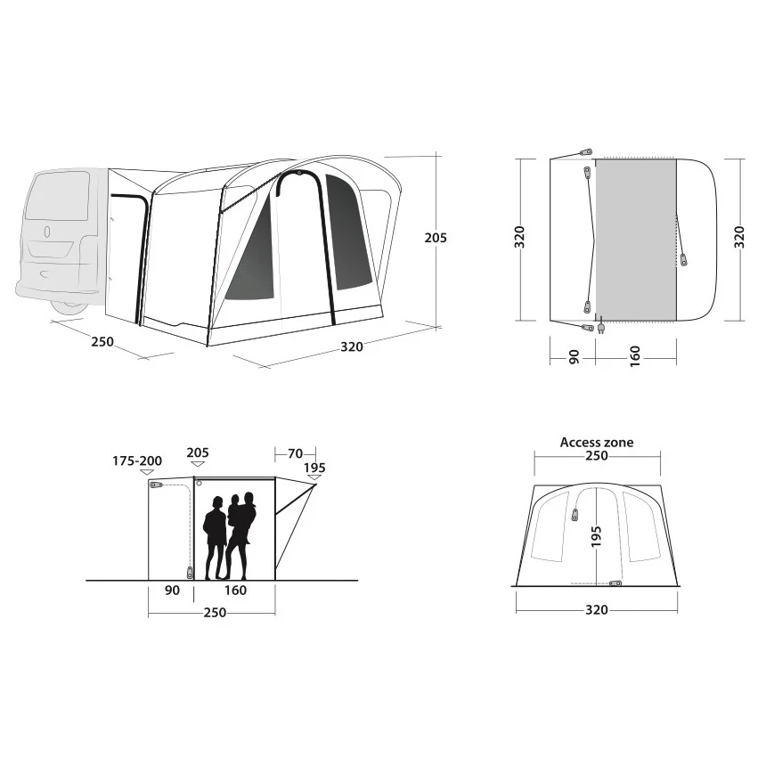 Per fissare la tenda all'auto, sono previste guide di cedro larghe 5 mm e 7 mm, in modo che si adatti alla larghezza delle guide. La tenda è regolabile in altezza da 175 a 200 cm. Il robusto sistema di fissaggio in velcro aggancia efficacemente il telo e i pali e fissa la tenda a terra con corde e picchetti, in modo che possa resistere senza problemi al vento. Le corde sono praticamente attorcigliate sul telo per evitare che si aggroviglino durante l'imballaggio. È possibile lasciare la tenda da sola e partire in auto.