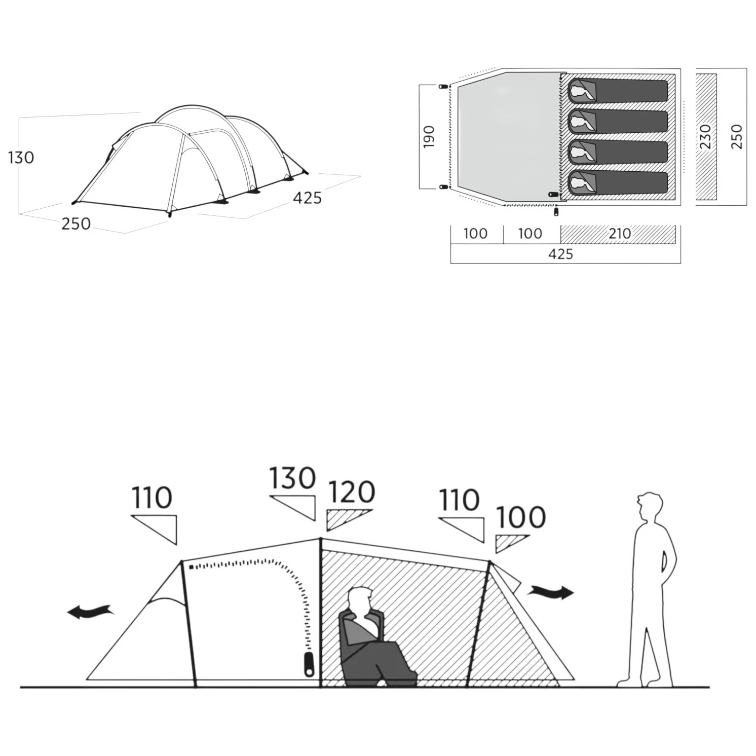 Hemsedal 4 offre un'ampia veranda che fornisce spazio sufficiente per riporre attrezzature, scarpe o bagagli. La veranda è dotata di un pavimento rimovibile, in modo da poter personalizzare la disposizione della tenda secondo le proprie esigenze. Il design anteriore e posteriore garantisce un piacevole flusso d'aria, e l'ingresso anteriore e laterale per la massima flessibilità d'uso.