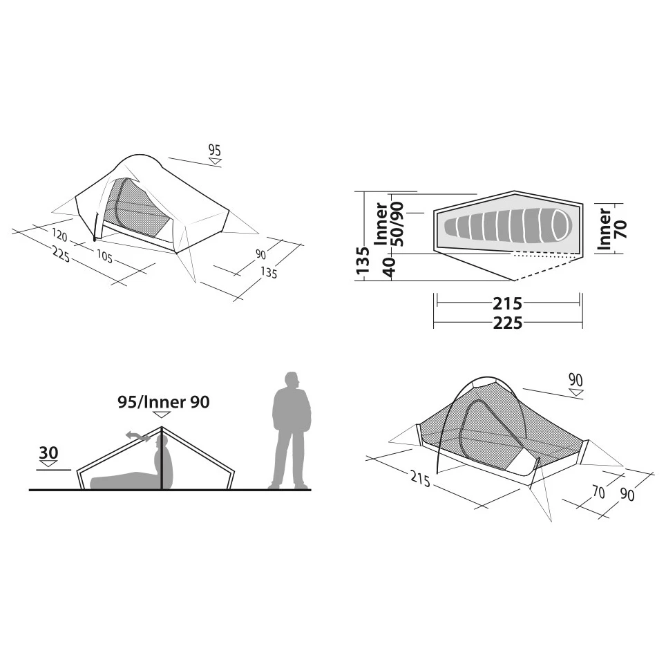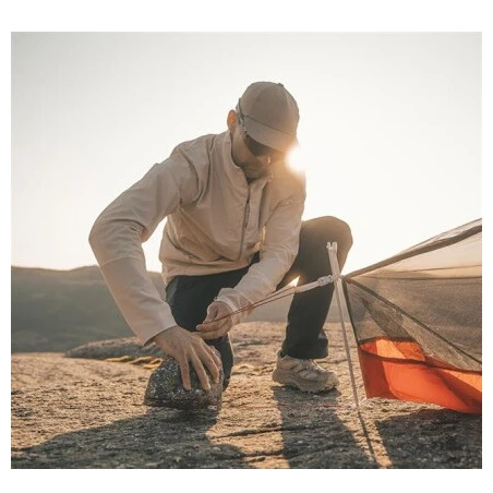 Per una protezione impeccabile in qualsiasi condizione atmosferica, ci pensa il telo esterno siliconizzato HydroTex SiliPoly RS, che non si allenta. Questo materiale ha una colonna d'acqua di 2000 mm e grazie al ripstop è resistente ai danni meccanici. La camera da letto è realizzata in nylon traspirante, il pavimento è in ripstop nylon trattato con poliuretano e ha una colonna d'acqua di 5000 mm. Le cuciture nastratesono una cosa ovvia. I materiali non contengono PFAS.