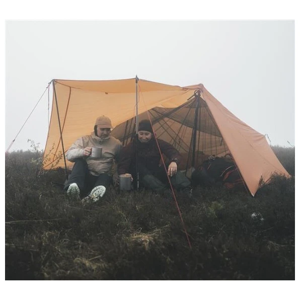 La struttura stessa è formata da bastoncini da trekking (non inclusi nella confezione). Le estremità della tenda sono rinforzate con montanti in carbonio che impediscono al sacco a pelo di toccare il telo esterno. La tenda offre opzioni di montaggio variabili - solo telo esterno, solo camera da letto o entrambi. Su entrambi i lati ci sono piccole verande per l'attrezzatura, che fungono anche da due ingressi. Il telo esterno all'ingresso è ribaltabile e offre una bella vista all'esterno. Nel complesso, il montaggio della tenda è molto semplice, veloce e la struttura resiste anche a forti venti.