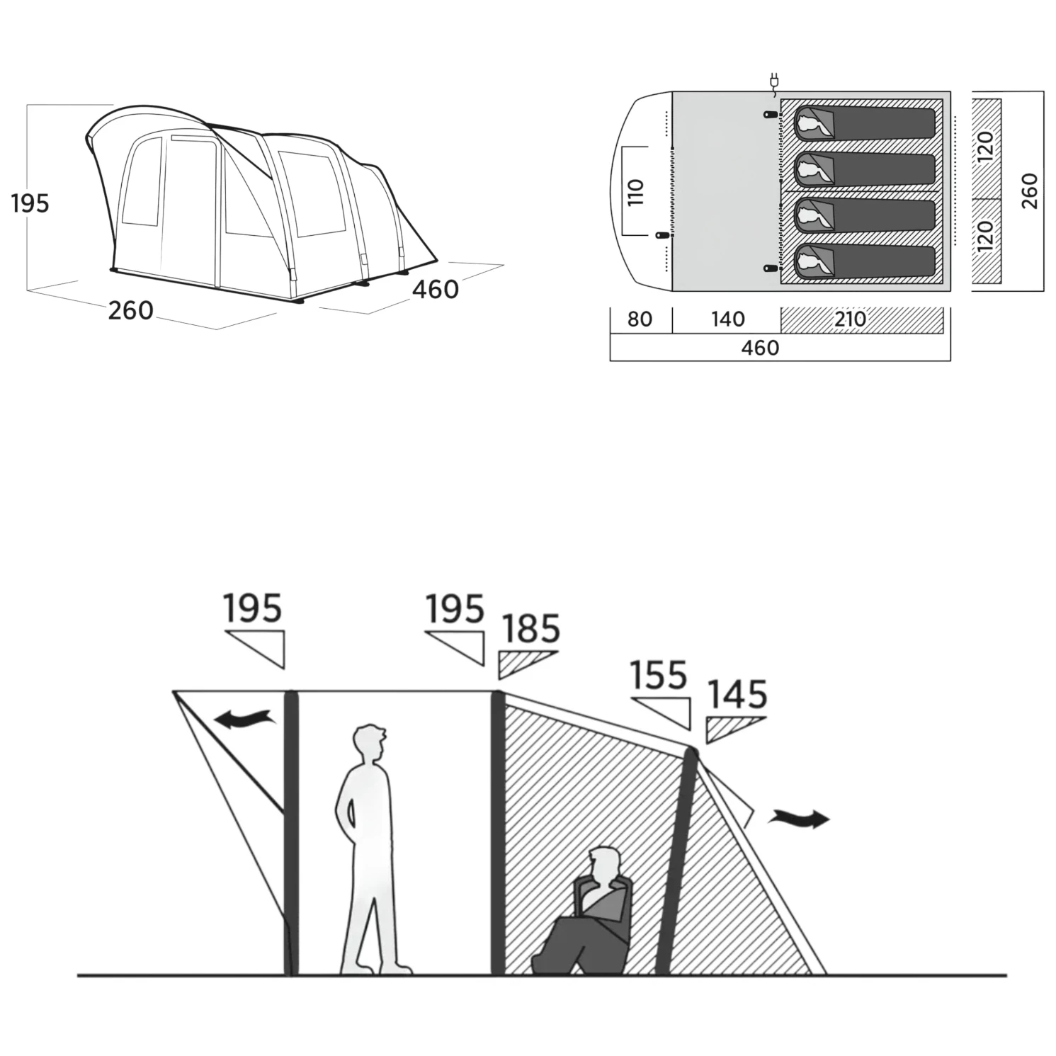• tipo: tenda a tunnel • capacità: 4 persone • stanze: 2 camere da letto, 1 spazio abitativo • doppio tetto: poliestere 190T rivestito in PU, WeatherGuard 3000, senza PFAS • colonna d'acqua: 3000 mm • pavimento: polietilene (integrato) • cuciture nastrate: sì • tubi: EnduraAir, TPU (senza PVC) • peso: 14,1 kg • dimensioni della tenda imballata: 72 × 39 × 36 cm • contenuto della confezione: pompa, picchetti, strumento per valvole