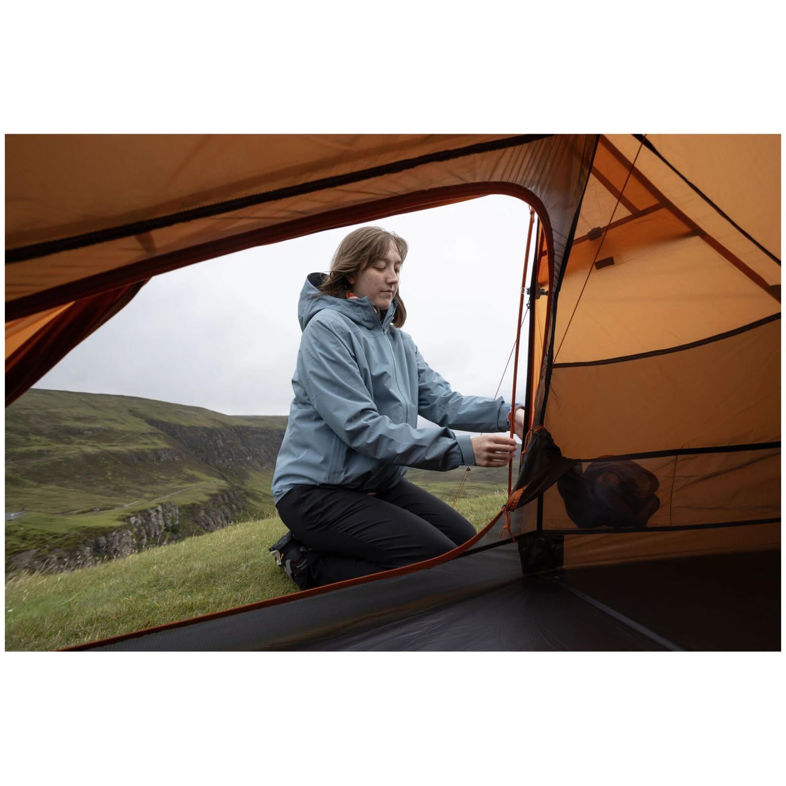 La tenda esterna è realizzata in nylon ripstop ultraleggero Protex® 10D, trattato con silicone e PU, offre una colonna d'acqua di 2.000 mm ed è 100% privo di PFC. Il telo inferiore in nylon ripstop 20D con una colonna d'acqua di 6.000 mm e un bordo rialzato di 10 cm garantisce una protezione affidabile dall'umidità anche in condizioni meteorologiche avverse.