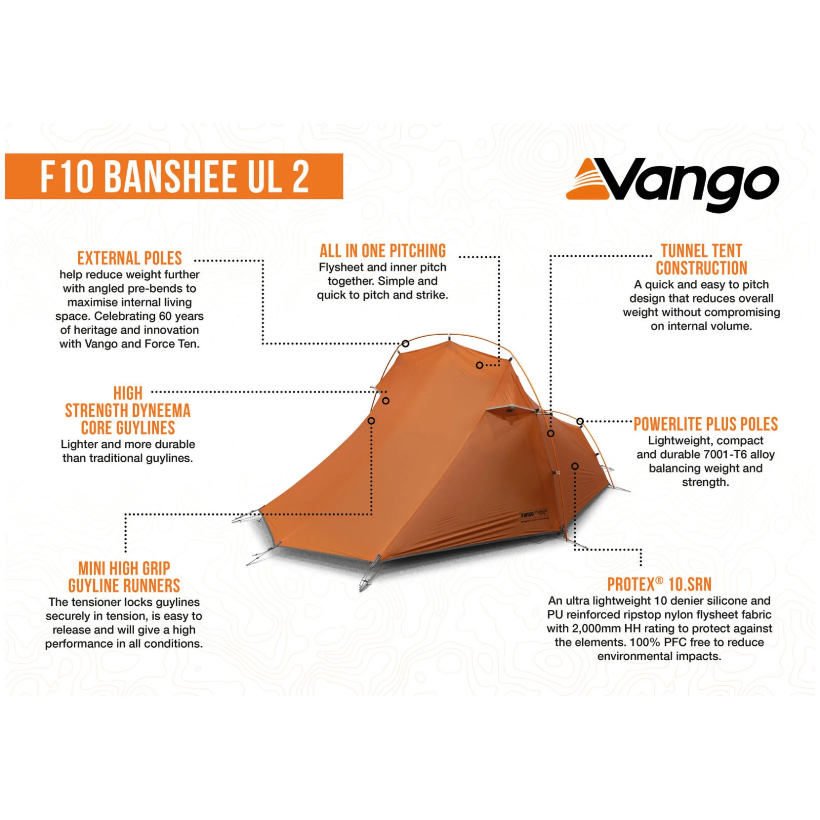 Il Force Ten Banshee UL2 rappresenta una rivisitazione moderna del leggendario modello Banshee, che da decenni protegge gli avventurieri in montagna, in valle e sulla costa. La struttura a tunnel consente un montaggio rapido e semplice della tenda, riducendo al contempo il peso complessivo senza limitare lo spazio interno. Grazie al sistema "tutto in uno", la tenda interna rimane agganciata al telo esterno, accelerando notevolmente il montaggio e lo smontaggio. La tenda può essere montata anche senza la parte interna, come un riparo minimalista.