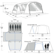 Grazie alla struttura gonfiabile e ai cerchi, alle cinghie e ai picchetti con codice colore , la tenda è facile e veloce da montare. Nella confezione sono presenti una pompa gonfiabile e una custodia per il trasporto con cinghie di compressione, che facilita il trasporto della tenda. Se si desidera ampliare lo spazio del corridoio, si consiglia di aggiungere una prolunga universale o una tenda universale.