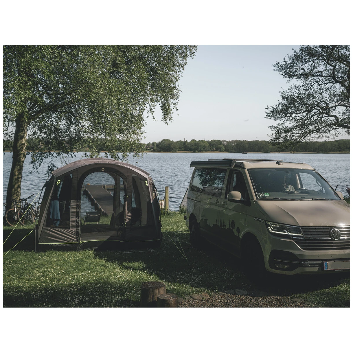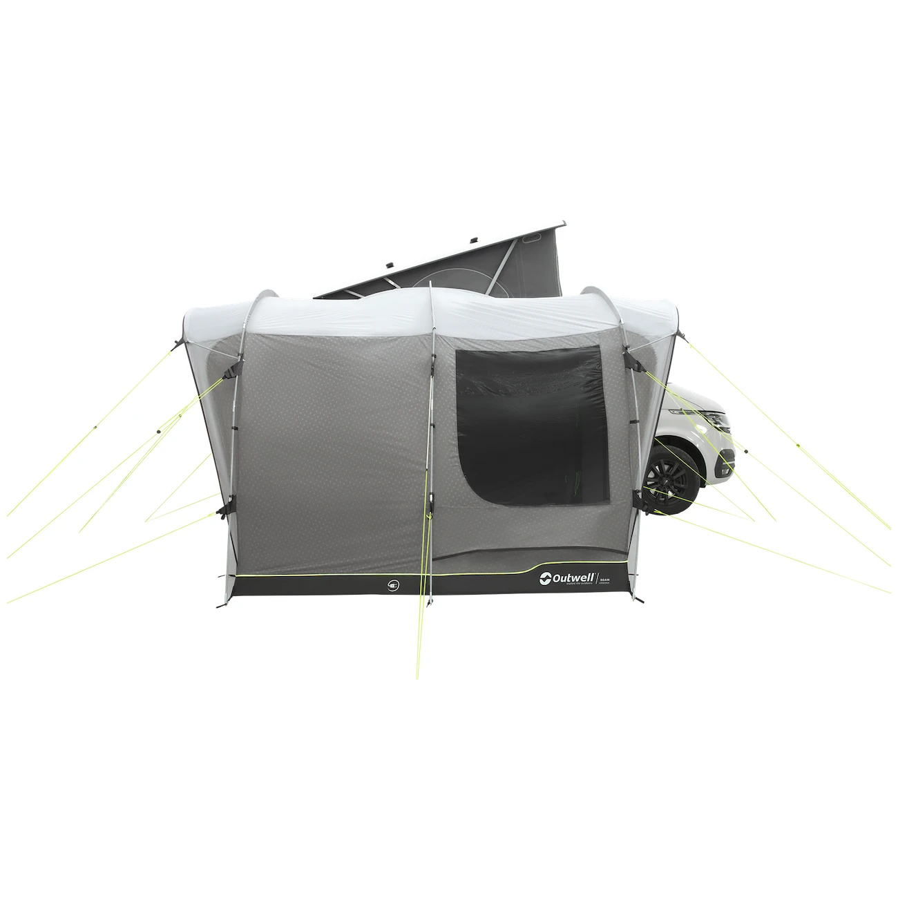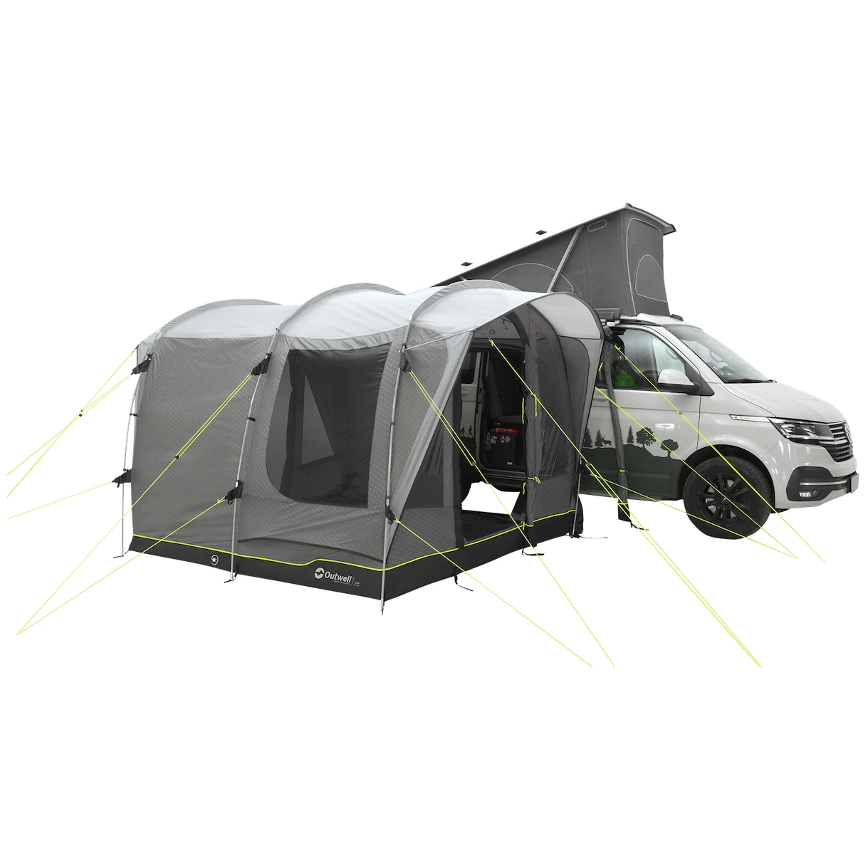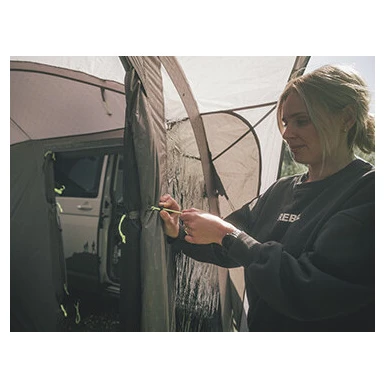 L'ingresso principale della tenda è dotato di un'ampia entrata accessibile alle sedie a rotelle con una zanzariera e una tettoia. Può essere completamente ripiegato di lato in modo da non rimanere appeso. Gli altri due ingressi laterali sono uno di fronte all'altro sul lato auto. Gli ampi finestrini oscurati offrono molta luce, ma anche protezione dai raggi UV e privacy. Possono essere tirate indietro e si può anche attaccare una stoffa scura per un sonno indisturbato.