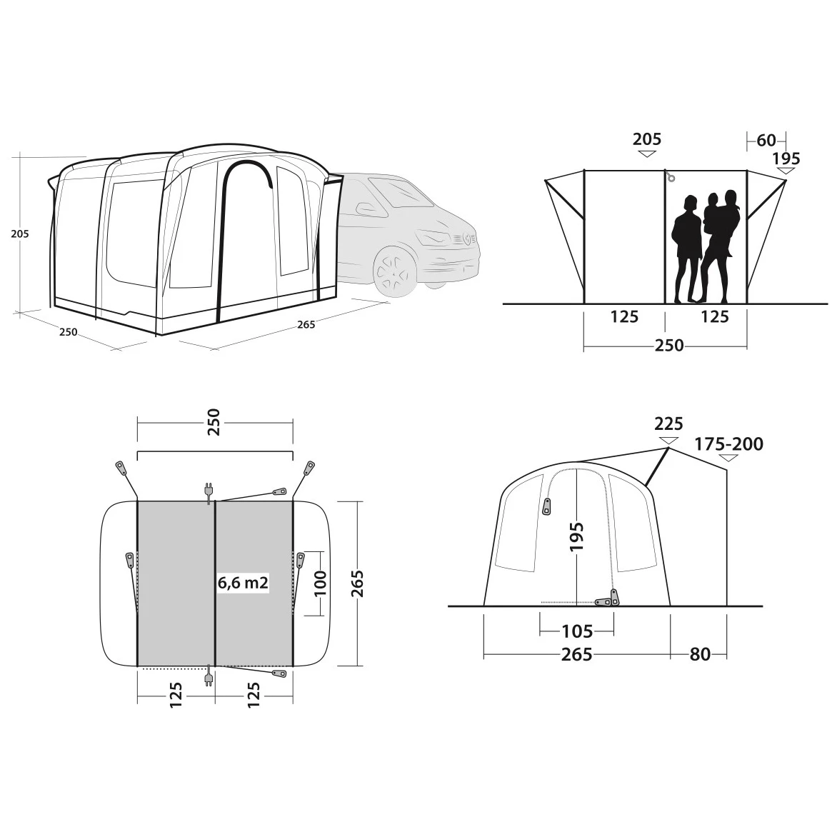 Per fissare la tenda all'auto, sono previste guide di cedro larghe 5 mm e 7 mm, in modo che si adatti alla larghezza delle guide. La tenda è regolabile in altezza da 175 a 200 cm. Il robusto sistema di fissaggio in velcro aggancia efficacemente il telo e i pali e fissa la tenda a terra con corde e picchetti, in modo che possa resistere senza problemi al vento. Le corde sono praticamente attorcigliate sul telo per evitare che si aggroviglino durante l'imballaggio. È possibile lasciare la tenda da sola e partire in auto.