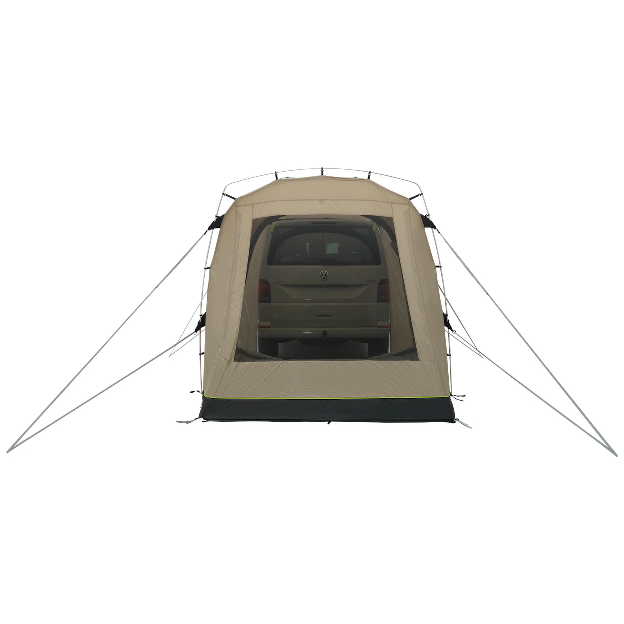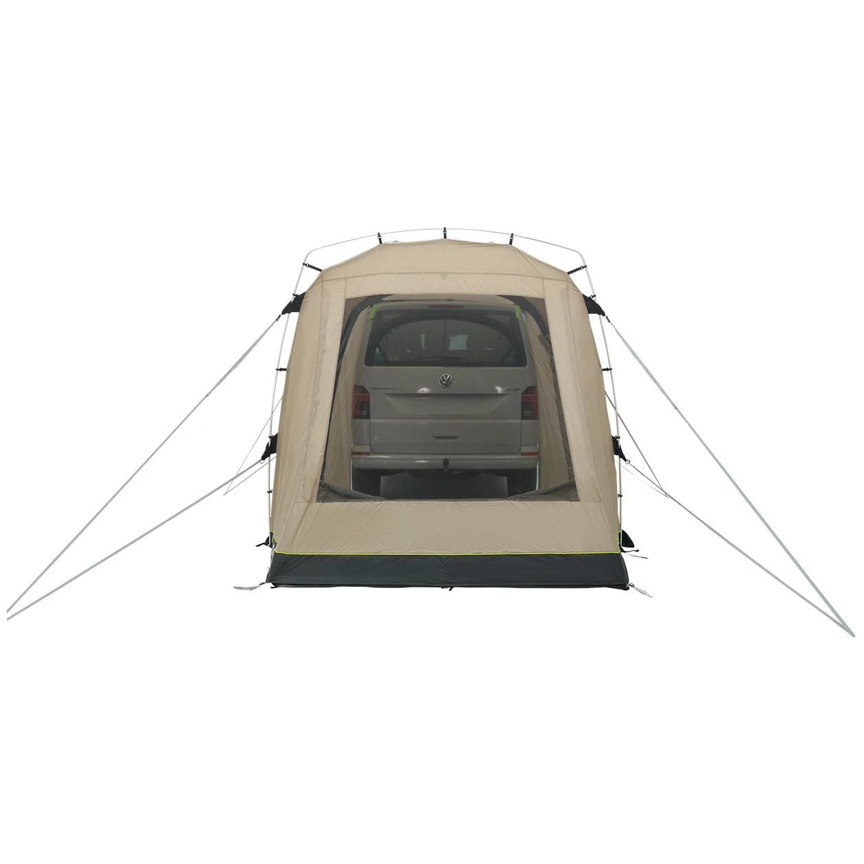 L'ingresso principale grande e senza barriere con zanzariera, che può essere utilizzato anche come tettoia (i pali non sono inclusi). I pannelli pieghevoli dal lato dell'auto forniscono un accesso protetto all'interno. La grande finestra oscurata lascia entrare molta luce, ma allo stesso tempo offre protezione dai raggi UV e privacy. Può essere chiusa con una tenda. La porta posteriore del veicolo può essere aperta verso l'interno, il sistema di fissaggio non blocca le porte laterali.
