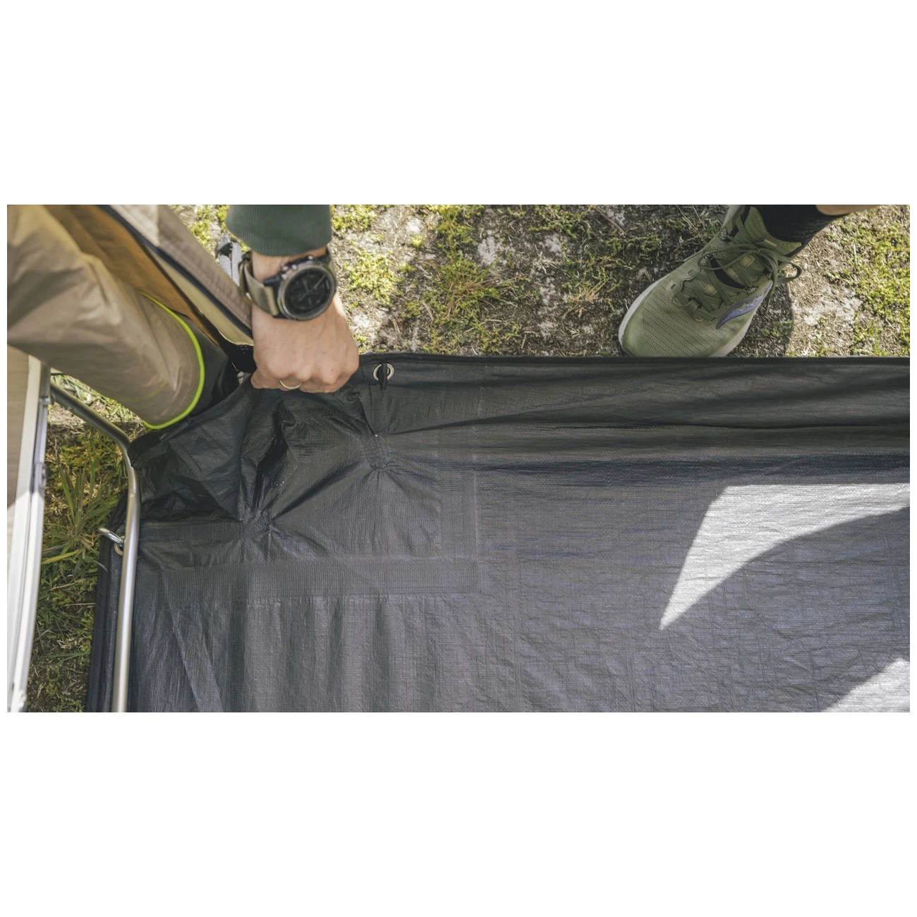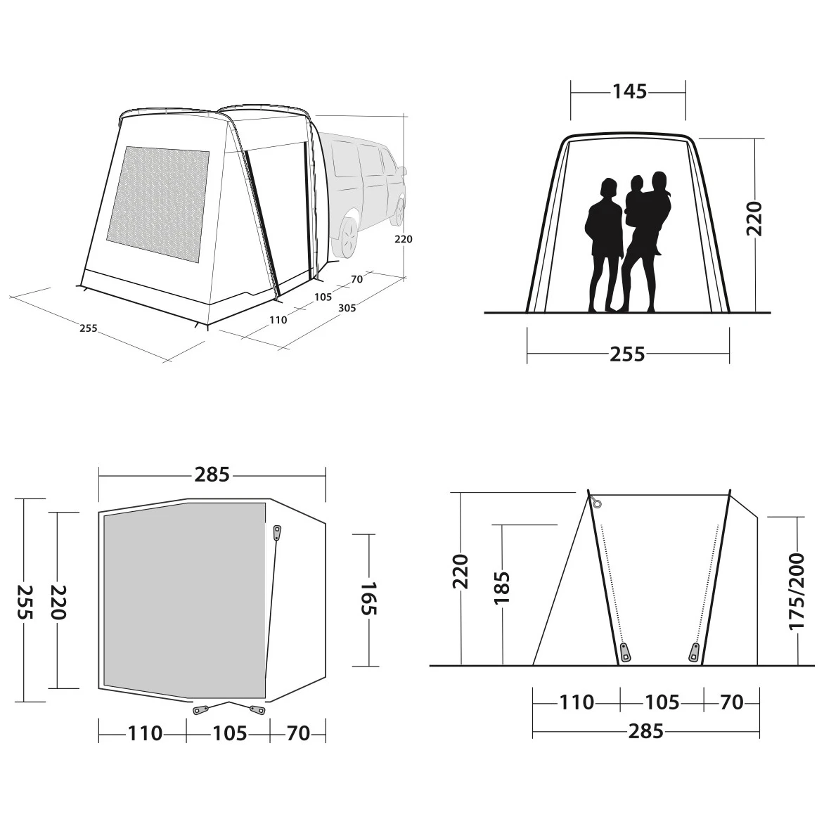 Per fissare la tenda all'auto, sono previste guide di cedro larghe 5 mm e 7 mm, in modo che si adatti alla larghezza delle guide. La tenda ha un'altezza regolabile nell'intervallo 175 - 205 cm. Il robusto sistema di fissaggio in velcro aggancia efficacemente il telo e i pali e fissa la tenda a terra con corde e picchetti, in modo che possa resistere senza problemi al vento. Le corde sono praticamente attorcigliate sul telo per evitare che si aggroviglino durante l'imballaggio.