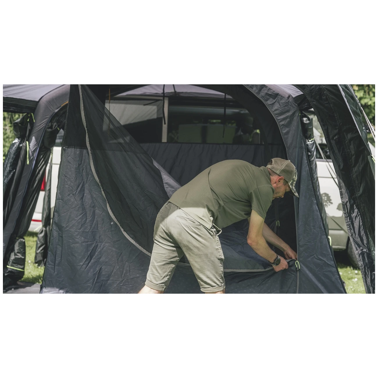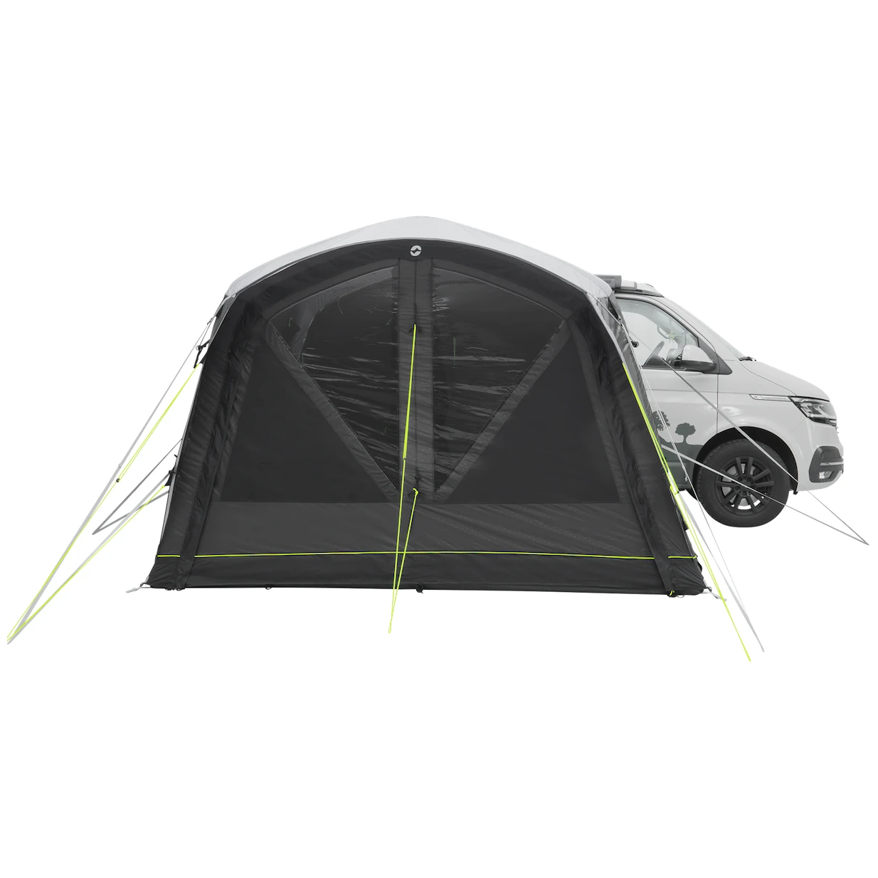 L'ingresso principale, grande e senza gradini, con zanzariera. Può essere completamente ripiegato di lato per non intralciare o aperto solo in alto per una ventilazione extra. Due porte laterali contrapposte consentono l'apertura completa della tenda. Gli ampi finestrini oscurati offrono molta luce, ma anche protezione dai raggi UV e privacy. Possono essere chiuse con le tende e oscurare lo spazio per dormire meglio.
