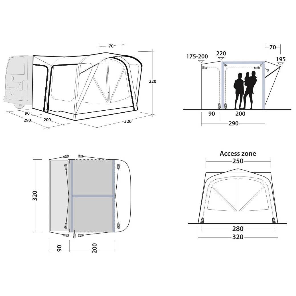 Per fissare la tenda all'auto, sono previste guide di cedro larghe 5 mm e 7 mm, in modo che si adatti alla larghezza delle guide. La tenda è regolabile in altezza da 175 a 200 cm. La tenda esterna accessoria può essere rimossa e orientata in modo flessibile rispetto al veicolo. Il sistema consente di scollegarsi rapidamente e di partire in auto, mentre la tenda rimane in piedi da sola.