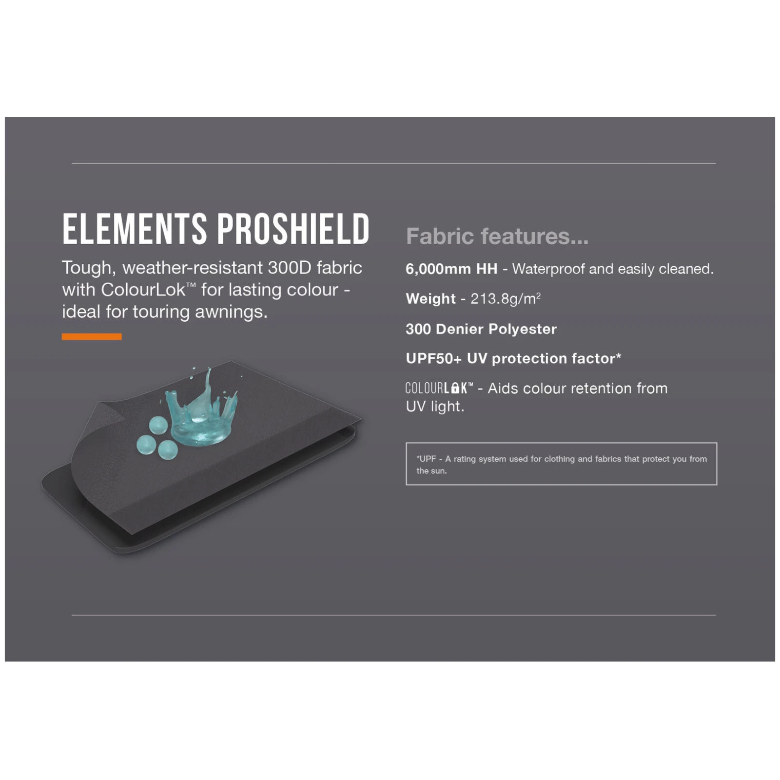 Il materiale utilizzato Elements ProShield con densità 300D offre elevata resistenza agli agenti atmosferici e una colonna d'acqua di 6.000 mm, quindi è possibile fare affidamento sulla tenda da sole anche in caso di maltempo. La tecnologia ColourLok™ aiuta a mantenere la solidità del colore anche in caso di esposizione prolungata ai raggi UV. La stabilità della struttura è garantita da SuperBeams rinforzati, traverse pre-piegate e AirBeams di rinforzo, che aumentano la resistenza e la durevolezza al vento.