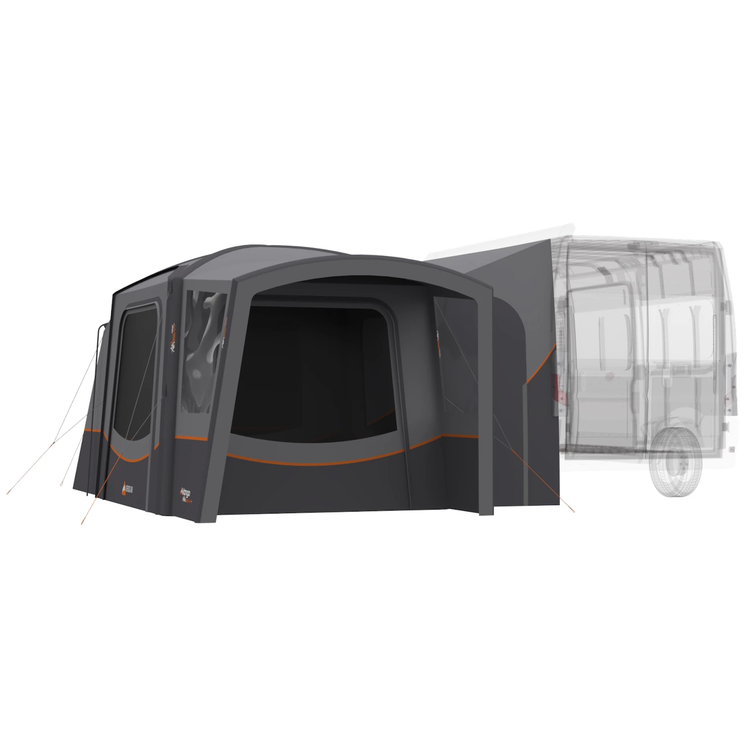 La parte principale del piazzale è dotata di quattro ingressi identici, accessibili alle sedie a rotelle. Inoltre, sono dotate di ampie finestre a triplo strato composte da zanzariere, PVC trasparente e tende. Il PVC e le tende sono staccabili tramite una cerniera, con la quale è possibile regolare la circolazione dell'aria. Nel rifugio ci sono anche due grandi finestre Diamond Clear per far entrare più luce naturale nella tenda. Per entrare nella tenda potete utilizzare anche altri due ingressi, che vi condurranno al passaggio tra la tenda e l'auto.