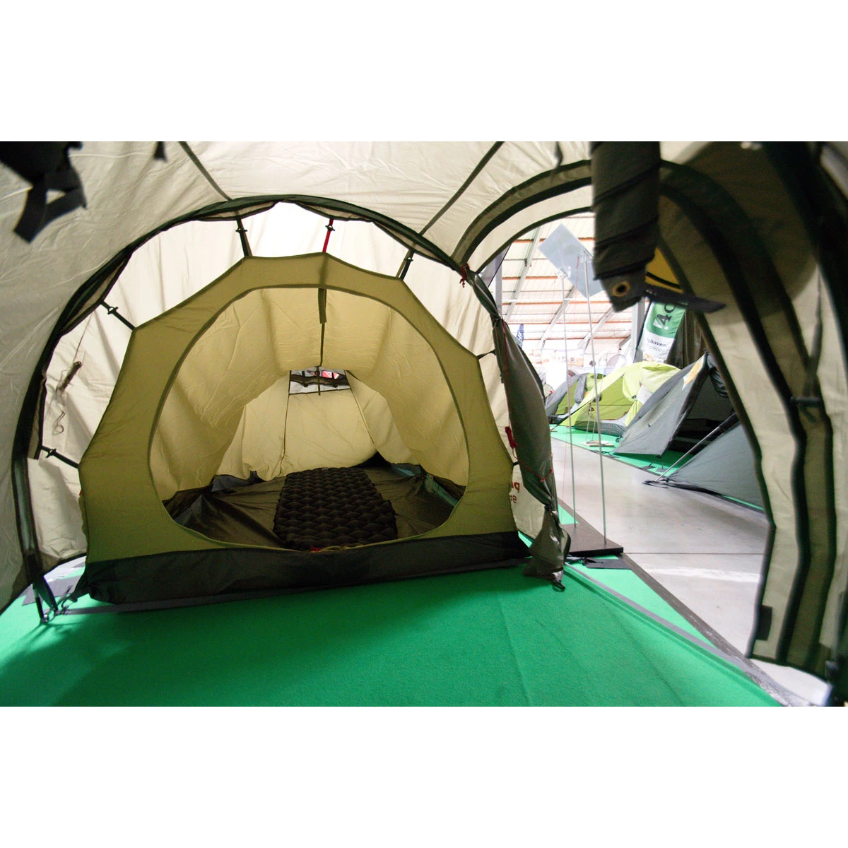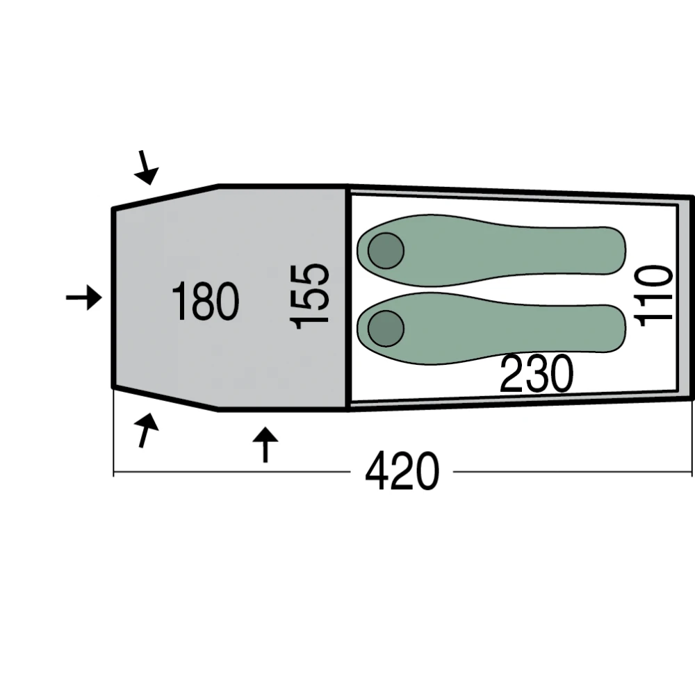 La tenda a doppio guscio è composta da una tenda interna e da un guscio esterno - un tropico. L'ingresso della tenda interna si trova sul lato anteriore. La tenda esterna è dotata di un ampio vestibolo adatto a riporre i bagagli o a cucinare, al quale si può accedere dall'ingresso frontale o laterale.