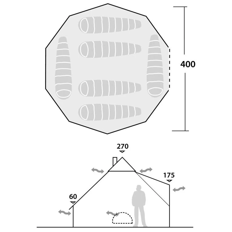 Stato Robens Klondike è una tenda spaziosa e popolare che offre un eccellente livello di comfort per un massimo di sei persone. Le porte verticali consentono un facile accesso, soprattutto in caso di maltempo. Intorno alla tenda ci sono grondaie che proteggono le porte e le pareti dall'assalto della pioggia. La fodera è dotata di una cerniera lungo tutto il perimetro. La bocchetta superiore, composta da due parti separate, può essere facilmente aperta e chiusa dall'interno tirando il cavo.