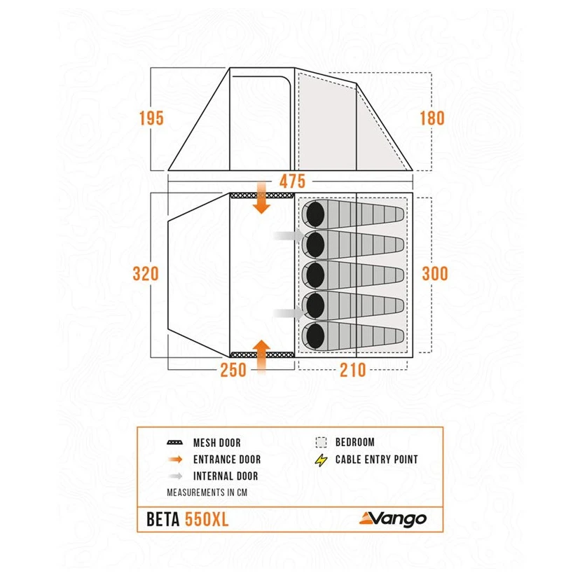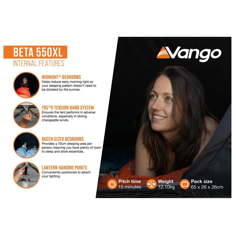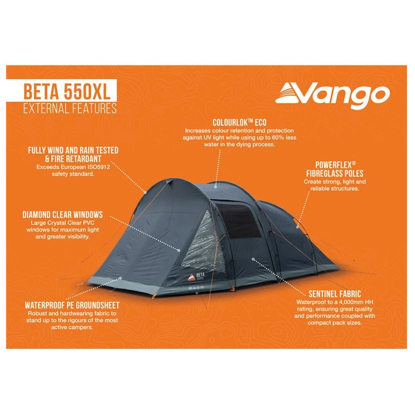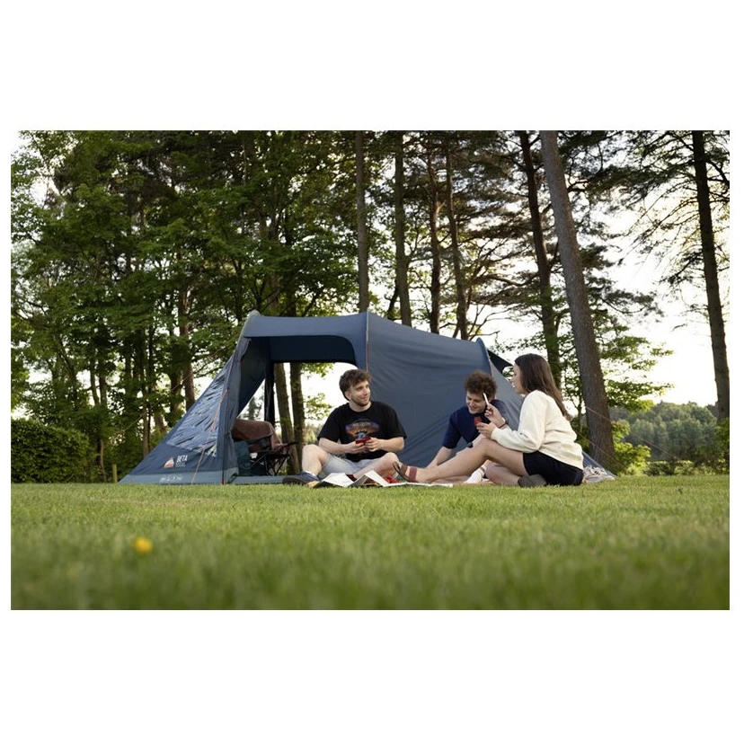 Vango Beta 550 XL è una tenda turistica a doppia parete per cinque persone che offre un ampio vestibolo di 7,5 m², offrendo molto spazio per rilassarsi e riporre le proprie cose. Ci sono due ingressi al corridoio, uno dei quali è dotato di una zanzariera che protegge efficacemente dagli insetti e contribuisce anche a una migliore circolazione dell'aria. Una zanzariera parziale si trova anche sull'ingresso interno esteso.