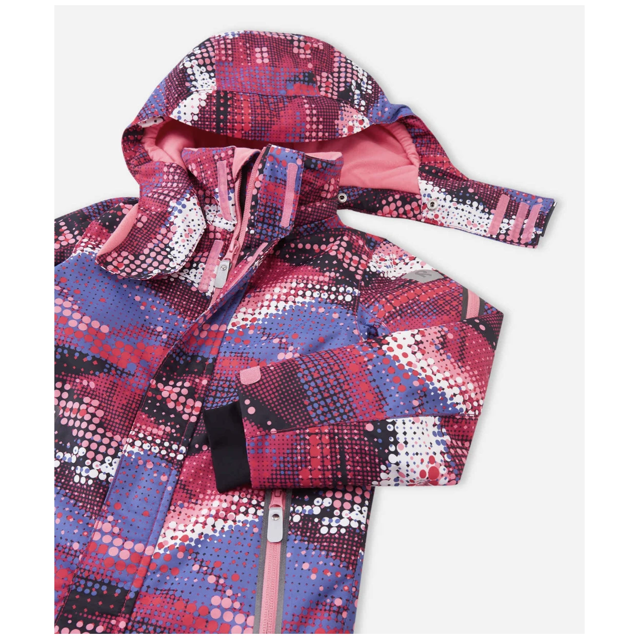 La tuta è dotata di un cappuccio staccabile e regolabile che protegge dal vento ed è sicuro per le attività all'aperto, in quanto il cappuccio fissato con bottoni a pressione si rimuove facilmente se si impiglia in qualcosa. Tasche con cerniera, tasca per skipass sulla manica. Il materiale della tuta respinge lo sporco e resiste ai lavaggi, se necessario. Questa tuta invernale funzionale e di alta qualità è completata da dettagli riflettenti.